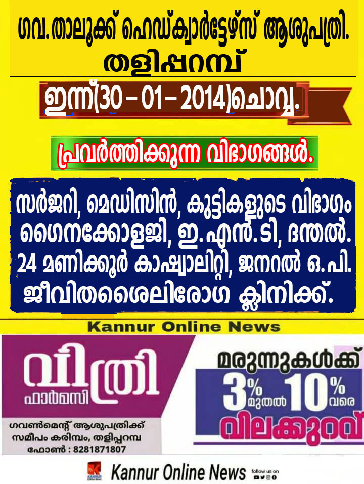 ഇന്ന്(30-01-2014)ചൊവ്വ. തളിപ്പറമ്പ് ഗവ.താലൂക്ക് ഹെഡ്ക്വാര്ട്ടേഴ്സ് ആശുപത്രിയില് പ്രവര്ത്തിക്കുന്ന വിഭാഗങ്ങള്.