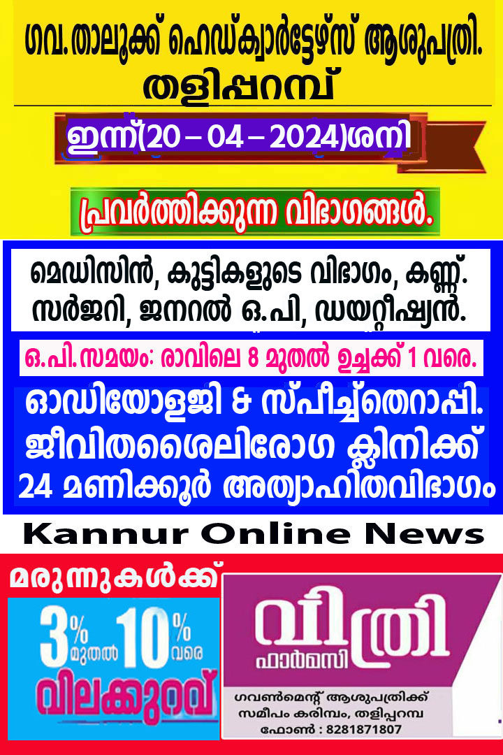 വാർത്തകൾ ഇന്ന്(20-04-2024)ശനി തളിപ്പറമ്പ് ഗവ.താലൂക്ക് ആശുപത്രിയില് ലഭിക്കുന്ന സേവനങ്ങള്. Kannur News April 20, 2024 ഇന്ന്(20-04-2024)ശനി തളിപ്പറമ്പ് ഗവ.താലൂക്ക് ആശുപത്രിയില് ലഭിക്കുന്ന സേവനങ്ങള്. മെഡിസിന്, കുട്ടികളുടെ വിഭാഗം, കണ്ണ്. സര്ജറി, ജനറല് ഒ.പി, ഡയറ്റീഷ്യന്. 24 മണിക്കൂര് അത്യാഹിതവിഭാഗം ജീവിതശൈലിരോഗ ക്ലിനിക്ക് ഓഡിയോളജി & സ്പീച്ച്തെറാപ്പി.