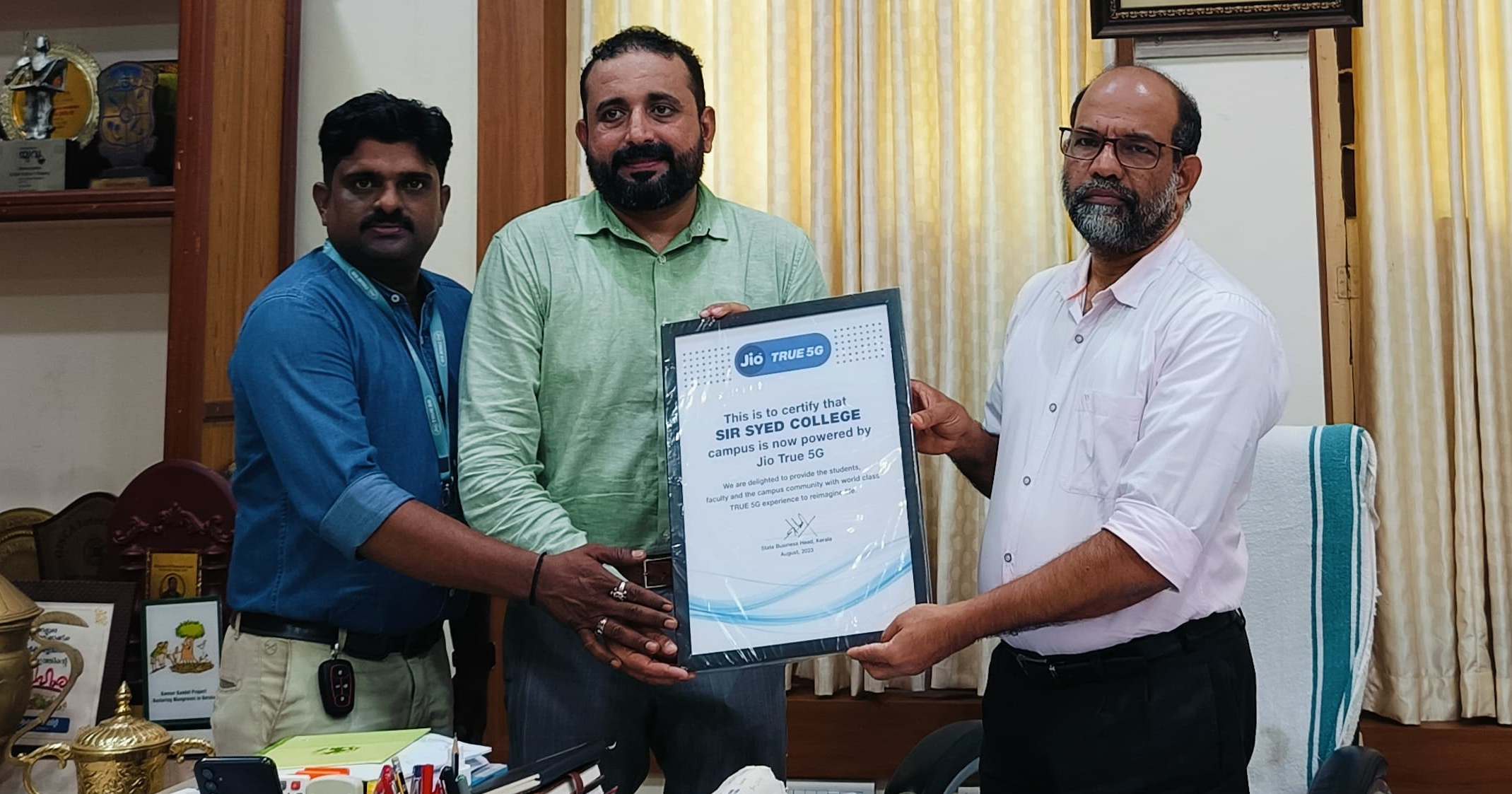 ജിയോ ട്രൂ 5 ജി സര്ട്ടിഫൈഡ് ക്യാമ്പസ് സര്ട്ടിഫിക്കറ്റ് കോളേജ് പ്രിന്സിപ്പല് ഡോ.ഇസ്മയില് ഓലായികര്ക്ക് കൈമാറി.
