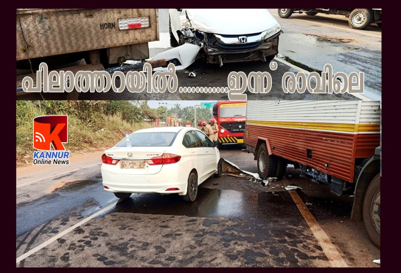 മല്സ്യവുമായി പയ്യന്നൂര് ഭാഗത്തേക്ക് പോകുന്ന ജി.എ 8 വി 3945 ഗോവ രജിസ്ട്രേഷന് കണ്ടെയിനര് ലോറിയും പഴയങ്ങാടിയിലേക്ക് പോകുന്ന കെ.എല് 13 എ.എഫ് 502 ഹോണ്ട സിറ്റി കാറുമാണ് രാവിലെ എട്ടോടെ കൂട്ടിയിടിച്ചത്.