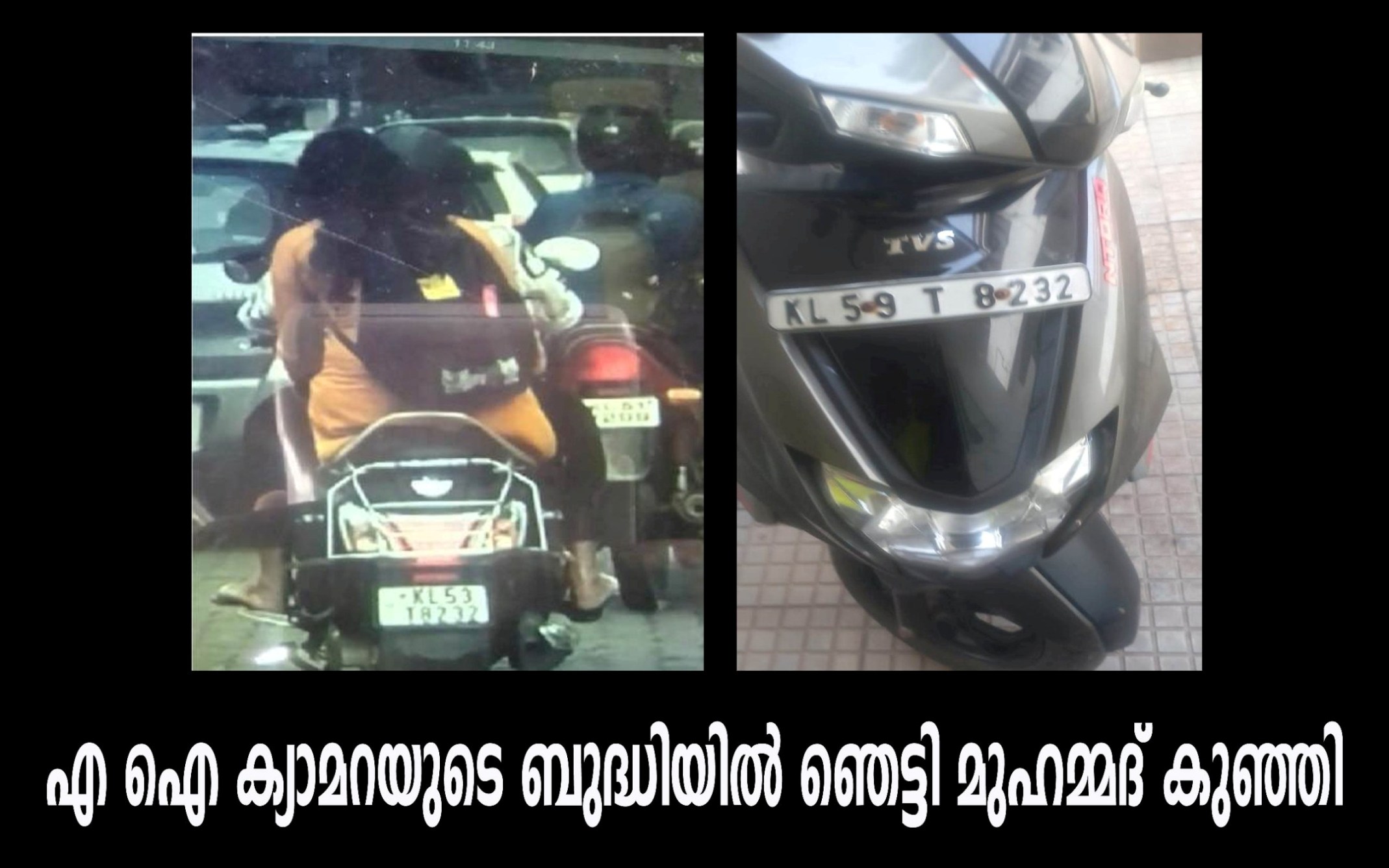 കെ എല് 53 ടി 8232 എന്ന സ്കൂട്ടറില് രണ്ടു പേര് സഞ്ചരിക്കുന്നതും അതില് പിറകിലിരുന്ന സ്ത്രീ ഹെല്മറ്റ് ധരിക്കാത്തതിനാല് എ ഐ ക്യാമറ ഫോട്ടോ പകര്ത്തുകയും, ആ ഫോട്ടോ സഹിതം പിഴയടക്കാനുള്ള നോട്ടീസ് അയച്ചതോ കെഎല് 59 ടി 8232 നമ്പര് ഉടമയായ മുഹമ്മദ് കുഞ്ഞിക്കും.