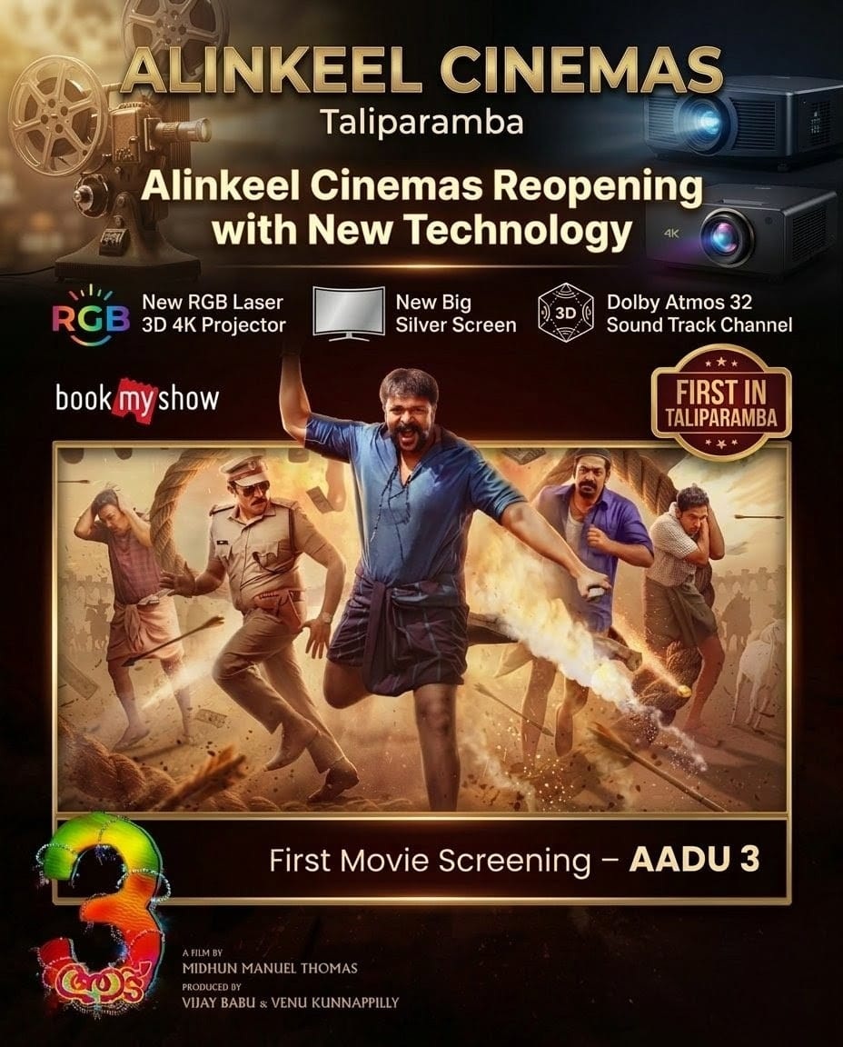 മാര്ച്ച്-19 ന് ആട്-3 എന്ന സിനിമയുടെ പ്രദര്ശനത്തോടെ ആലിങ്കീല് ഫോര്-കെ ദൃശ്യാനുഭവം നല്കുകയാണ്.