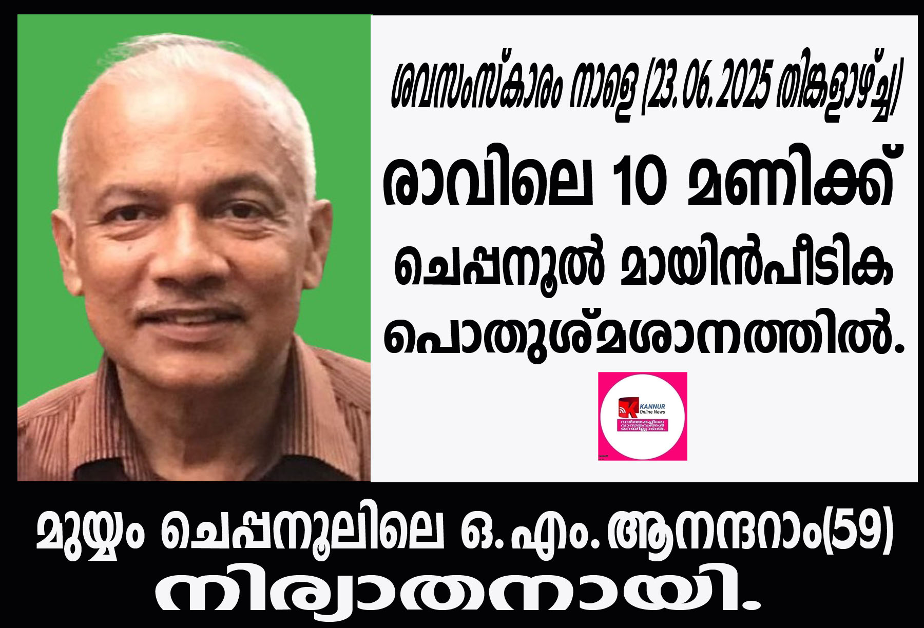 ശവസംസ്കാരം നാളെ (23.06.2025 തിങ്കളാഴ്ച്ച) രാവിലെ 10 മണിക്ക് ചെപ്പനൂല് മായിന്പീടിക പൊതുശ്മശാനത്തില്.