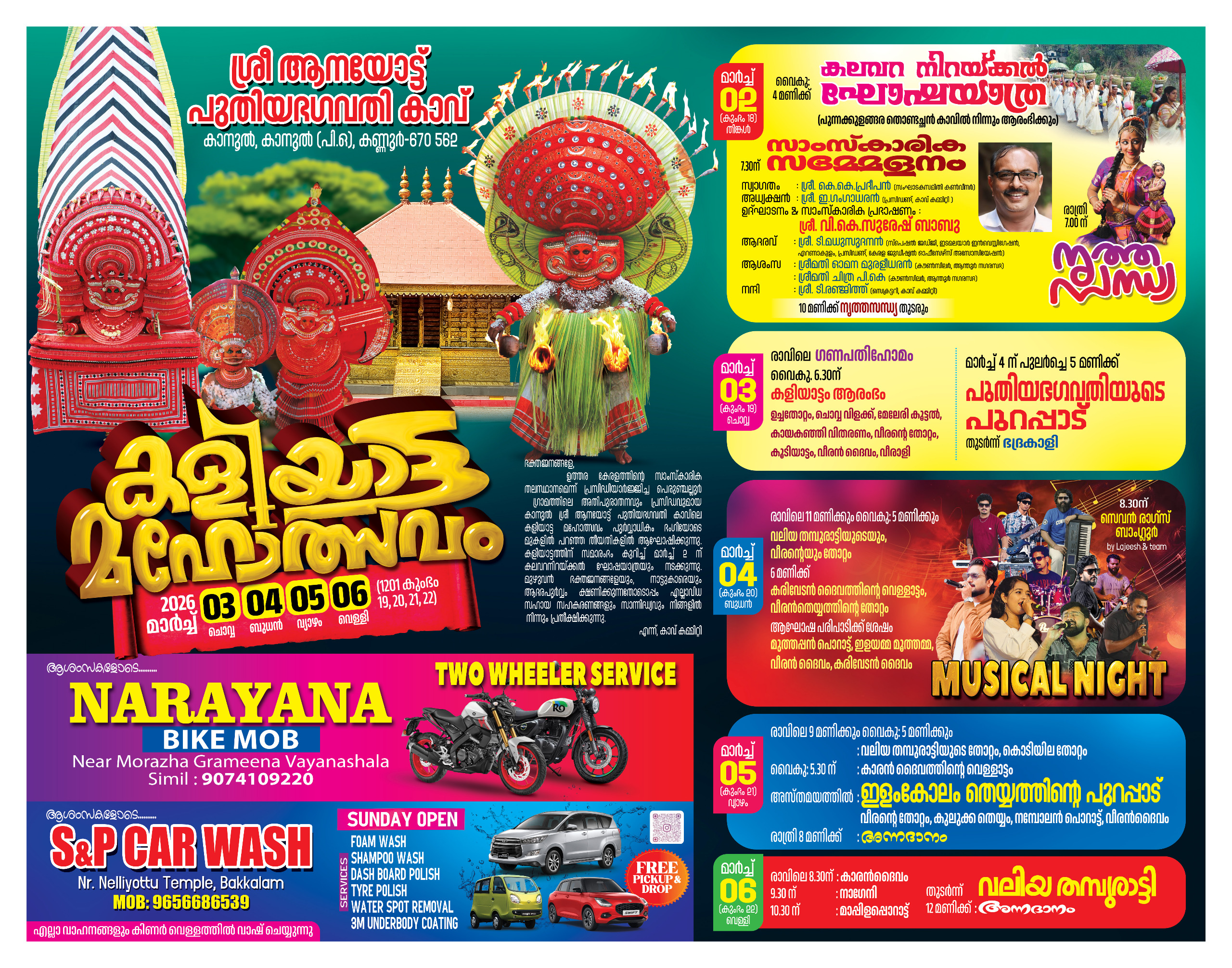 മാര്ച്ച് 3 കളിയാട്ടം ആരംഭം, രാവിലെ ഗണപതി ഹോമം രാത്രി മേലേരി കൂട്ടല്, കായകഞ്ഞി വിതരണം, വീരന്റ തോറ്റം, വീരന്, വീരാളി തെയ്യങ്ങള്.