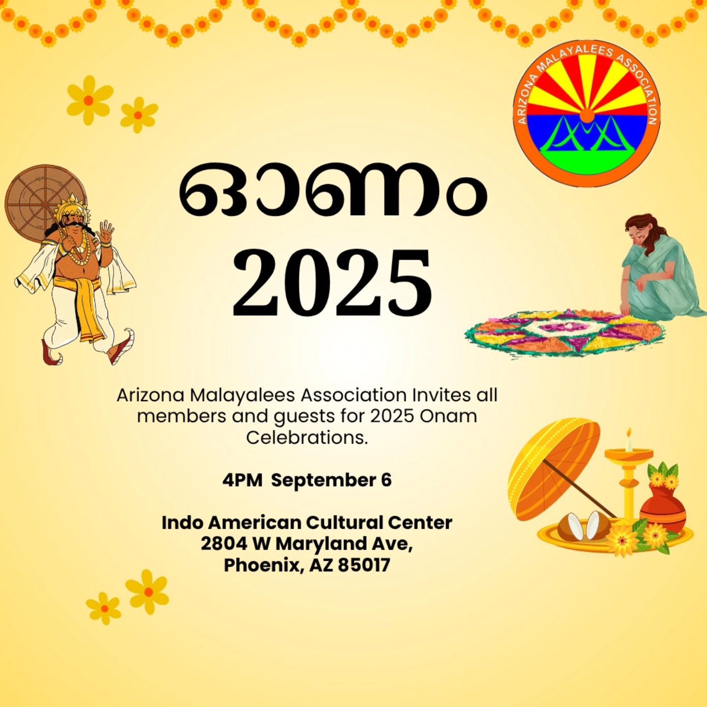 സെപ്റ്റംബര് 6-ാം തീയതി ശനിയാഴ്ച വൈകിട്ട് 4 മണി മുതല് ഇന്ഡോ അമേരിക്കന് കള്ച്ചറല് സെന്റര് (2804 W Maryland Ave, Phoenix, AZ 85017) വേദിയില് വിപുലമായ പരിപാടികളോടെയാണ് ഓണാഘോഷം നടക്കുന്നത്.