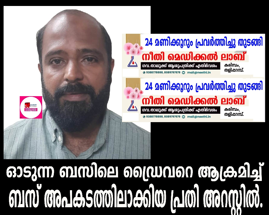 ഓടുന്ന ബസിലെ ഡ്രൈവറെ ആക്രമിച്ച് ബസ് അപകടത്തിലാക്കിയ പ്രതി അറസ്റ്റില്.