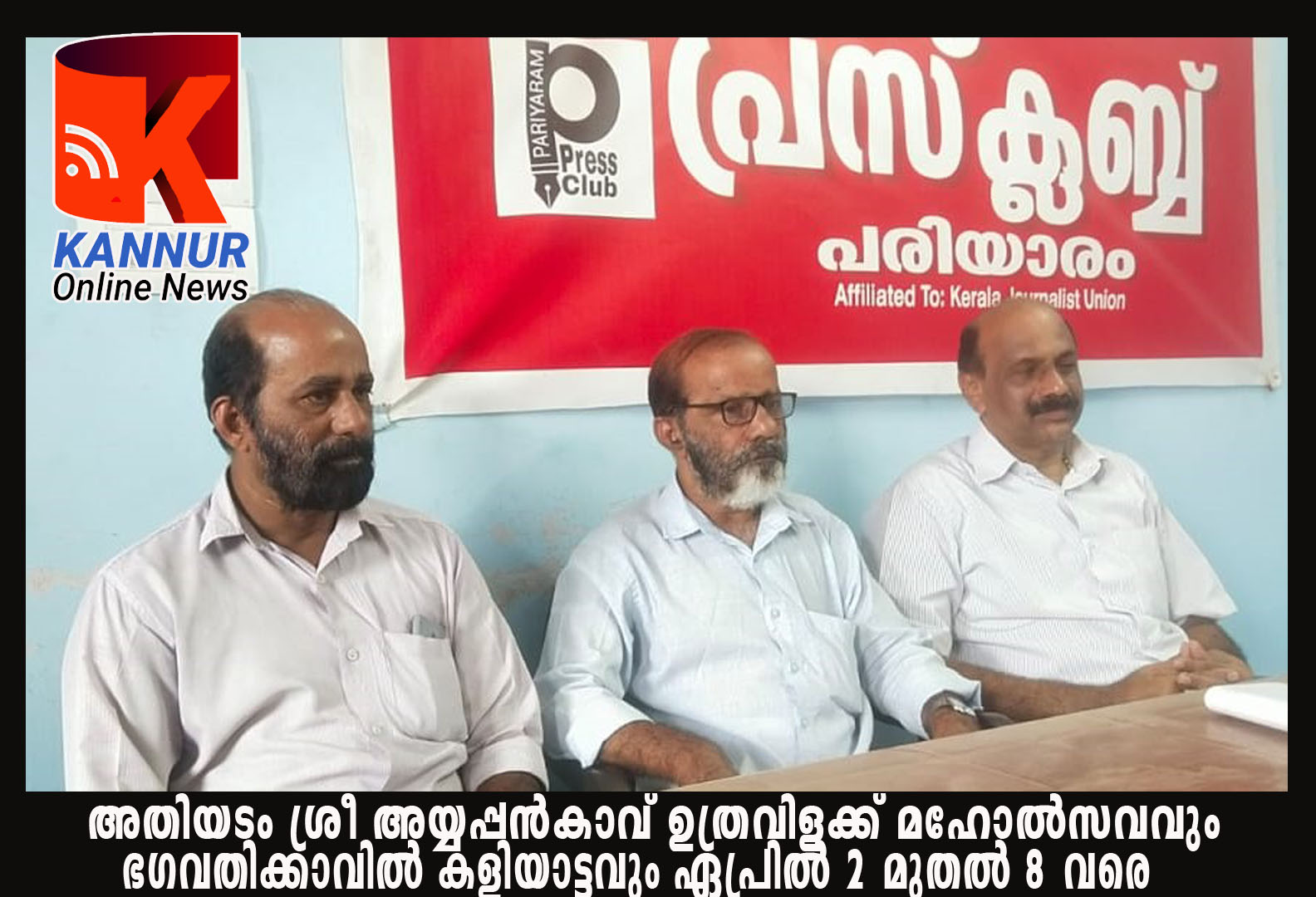 പരിയാരം: അതിയടം ശ്രീ അയ്യപ്പന്കാവ് ഉത്രവിളക്ക് മഹോല്സവവും ഭഗവതിക്കാവില് കളിയാട്ടവും ഏപ്രില് 2 മുതല് 8 വരെ വിവിധ പരിപാടികളോടെ ആഘോഷിക്കുമെന്ന് ഭാരവാഹികള് പരിയാരം പ്രസ്ക്ലബ്ബില് നടത്തിയ വാര്ത്താ സമ്മേളനത്തില് അറിയിച്ചു.