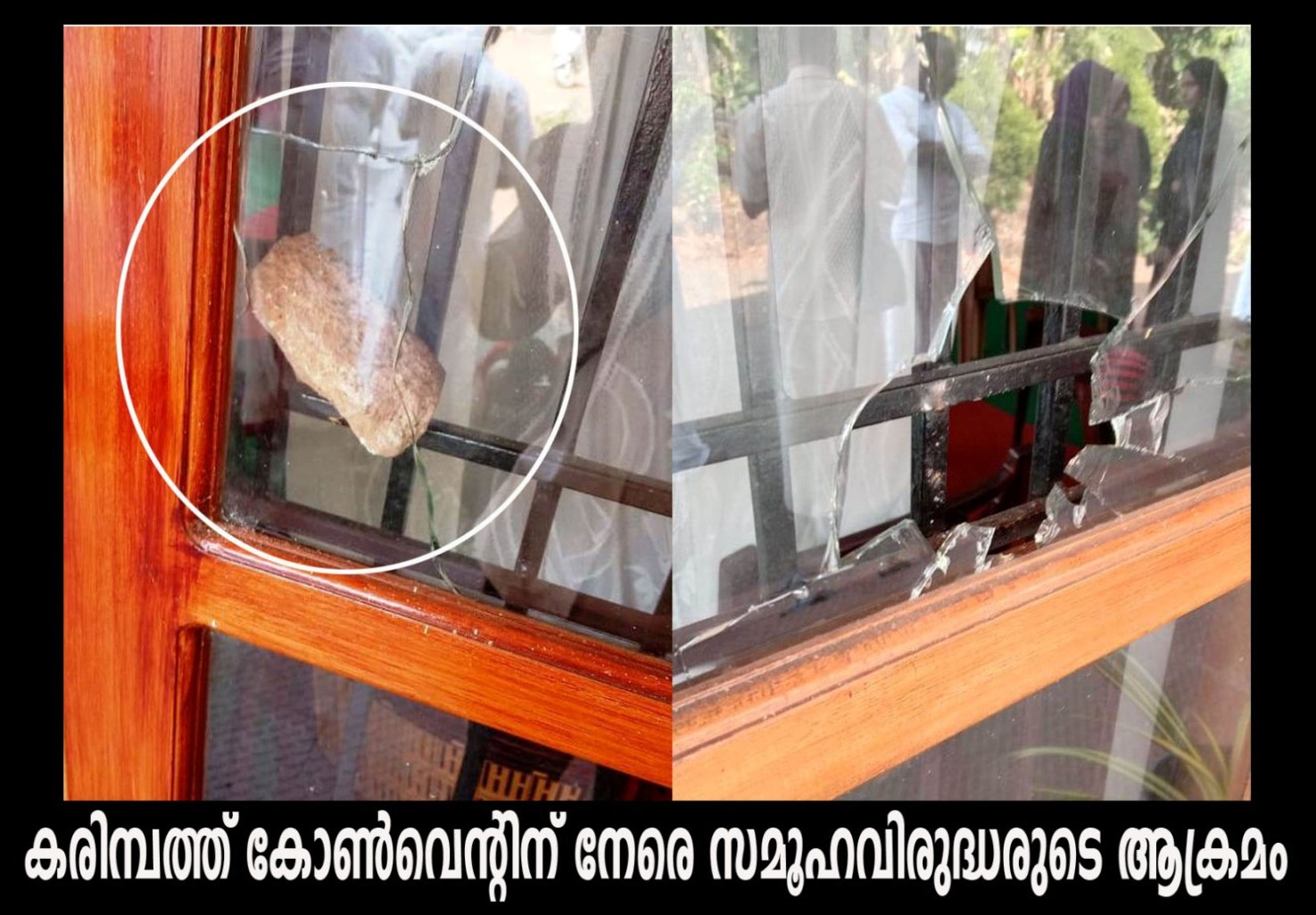 എറിഞ്ഞ കല്ല് ജനല് ചില്ലുകള്ക്കിടയില് കുടുങ്ങിക്കിടക്കുന്നുണ്ട്.