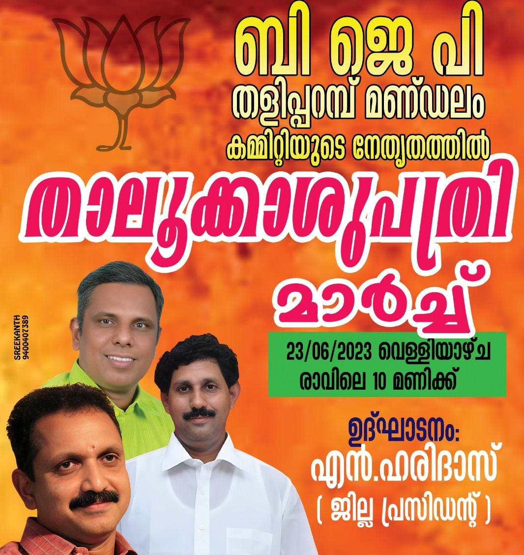 ബി.ജെ.പി തളിപ്പറമ്പ് മണ്ഡലം കമ്മറ്റിയുടെ നേതൃത്വത്തില് നാളെ(ജൂണ്-23-വെള്ളി) തളിപ്പറമ്പ് താലൂക്ക് ആശുപത്രിയിലേക്ക് മാര്ച്ച് നടത്തും.