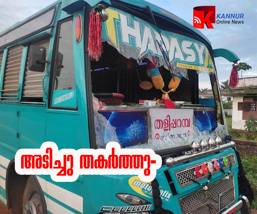 തളിപ്പറമ്പ്: തളിപ്പറമ്പില്‍ സ്വകാര്യബസിന് നേരെ ആക്രമം, മുന്‍വശത്തെ ചില്ലുകള്‍ അടിച്ചു തകര്‍ത്തു.