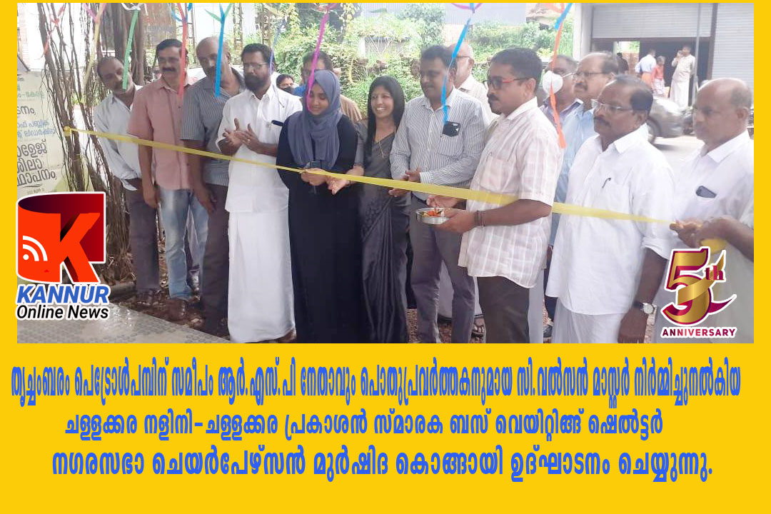 തളിപ്പറമ്പ്: തൃച്ചംബരം പെട്രോള്പമ്പിന് സമീപം ആര്.എസ്.പി നേതാവും പൊതുപ്രവര്ത്തകനുമായ സി.വല്സന് മാസ്റ്റര് നിര്മ്മിച്ചുനല്കിയ ചള്ളക്കര നളിനി-ചള്ളക്കര പ്രകാശന് സ്മാരക ബസ് വെയിറ്റിങ്ങ് ഷെല്ട്ടര് നഗരസഭാ നഗരസഭാ ചെയര്പേഴ്സന് മുര്ഷിദ കൊങ്ങായി ഉദ്ഘാടനം ചെയ്തു.