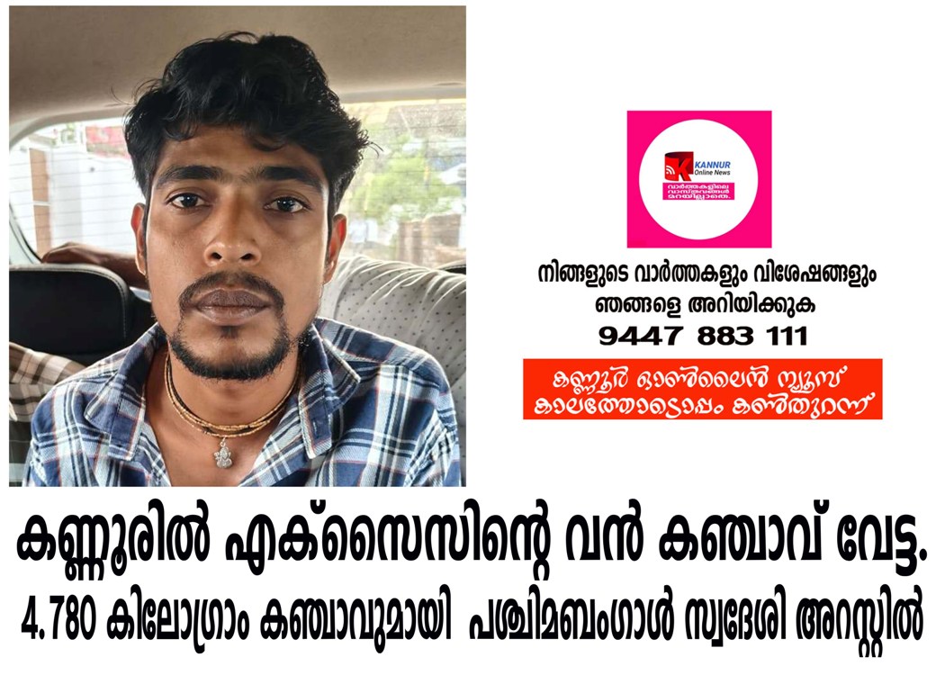 കണ്ണൂരില് എക്സൈസിന്റെ വന് കഞ്ചാവ് വേട്ട. 4.780 കിലോഗ്രാം കഞ്ചാവുമായി പശ്ചിമബംഗാള് സ്വദേശി അറസ്റ്റില്.