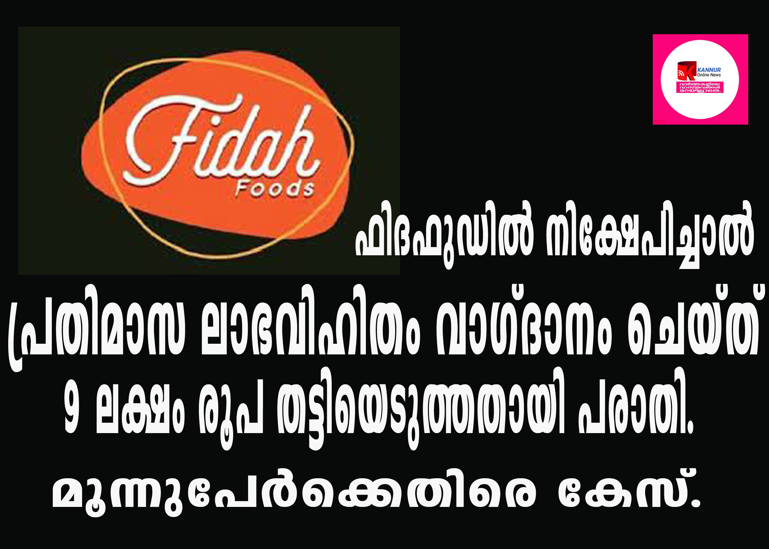 പൊടിക്കുണ്ടില് പ്രവര്ത്തിക്കുന്ന ഫിദഫുഡ് എന്ന സ്ഥാപനത്തില് പണം നിക്ഷേപിച്ചാല് ഒരു ലക്ഷം രൂപക്ക് പ്രതിമാസം 1400 രൂപ ലാഭവിഹിതം ലഭിക്കുമെന്ന് പ്രതികള് ഫാത്തിമയെ വിസ്വസിപ്പിക്കുകയും,