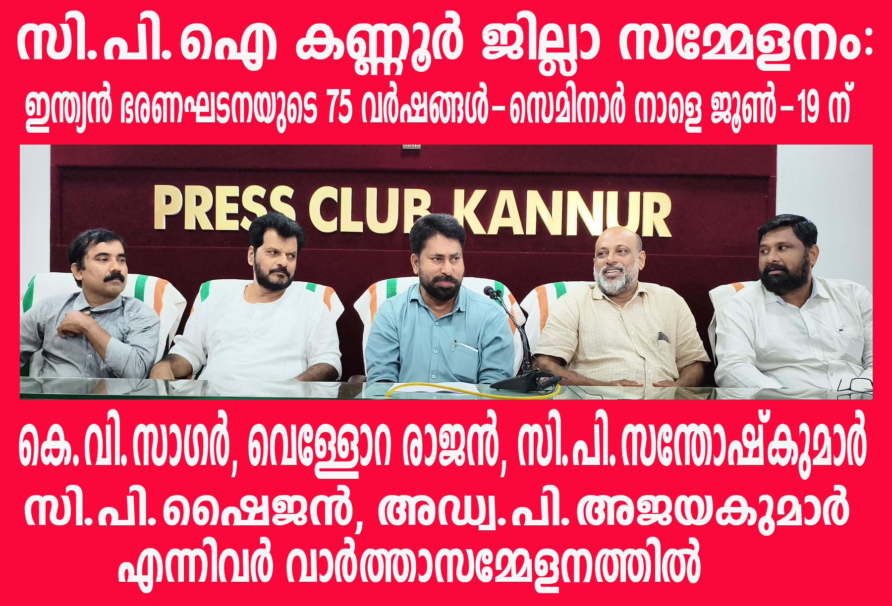 സി.പി.ഐ കണ്ണൂര് ജില്ലാ സമ്മേളനം: ഇന്ത്യന് ഭരണഘടനയുടെ 75 വര്ഷങ്ങള്-സെമിനാര് നാളെ ജൂണ്-19 ന്