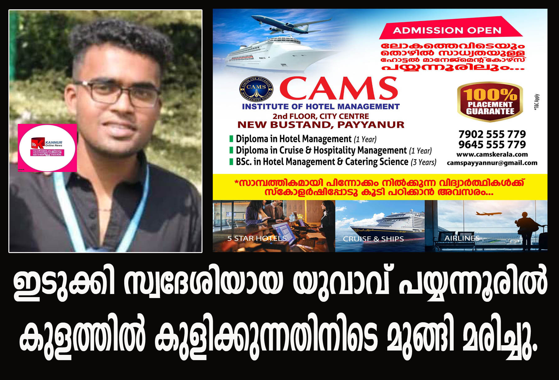 ഇടുക്കി സ്വദേശിയായ യുവാവ് പയ്യന്നൂരില് കൂട്ടുകാരോടൊപ്പം കുളത്തില് കുളിക്കുന്നതിനിടെ മുങ്ങി മരിച്ചു.