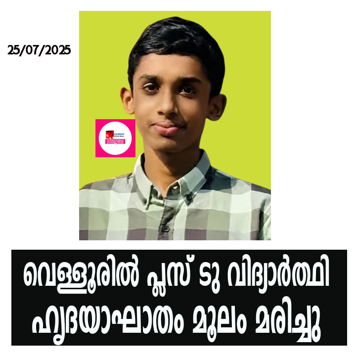പയ്യന്നൂര്: വെള്ളൂര് ഹയര് സെക്കണ്ടറി സ്കൂളിലെ പ്ലസ് ടു വിദ്യാര്ത്ഥി ഹൃദയാഘാതം മൂലം മരിച്ചു.