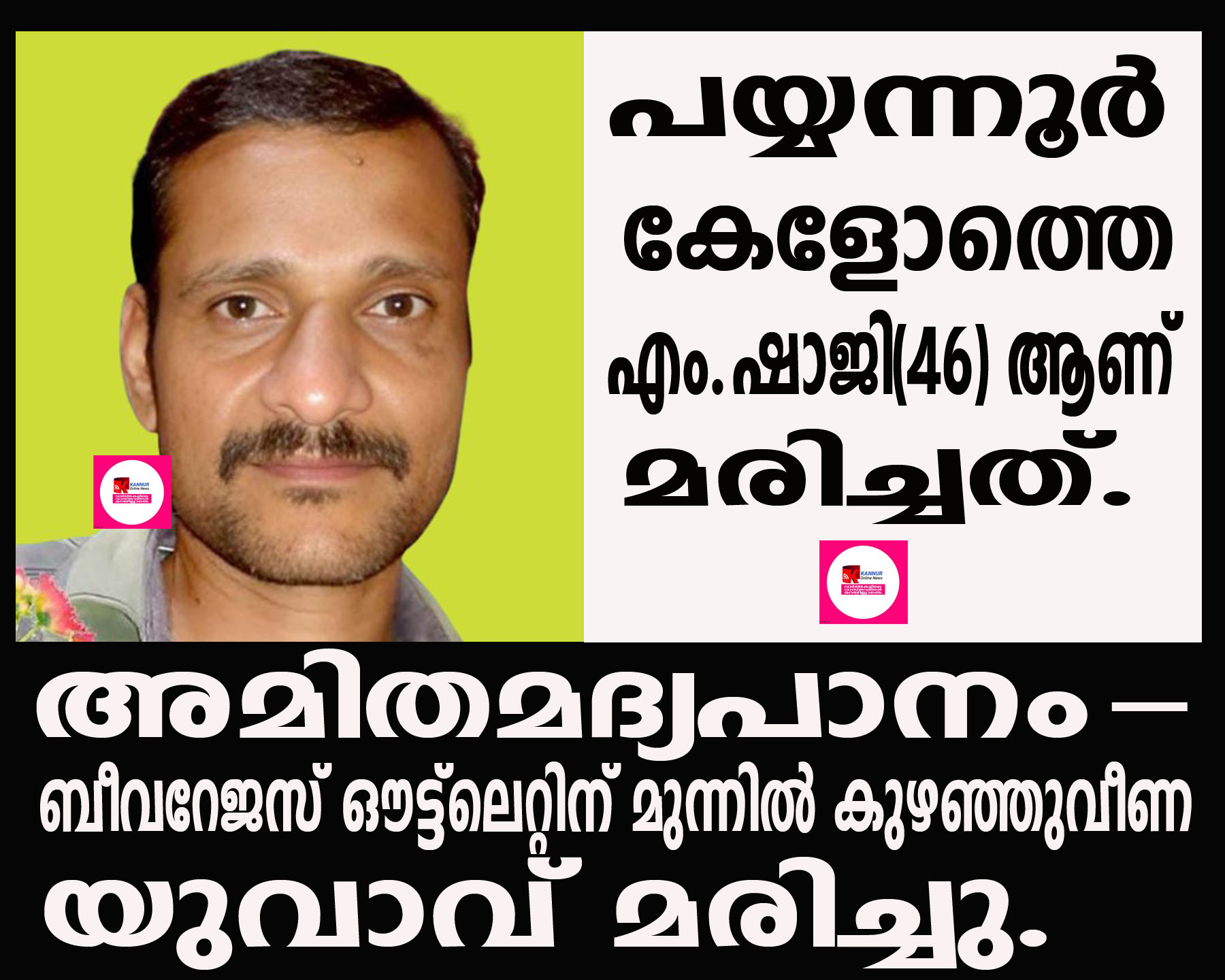 അമിതമായി മദ്യപിച്ച് പയ്യന്നൂരിലെ ബിവറേജ് ഔട്ട്ലെറ്റിന് മുന്നില് കുഴഞ്ഞുവീണ ഷാജിയെ ഉടന് പരിയാരത്തെ കണ്ണൂര് ഗവ.മെഡിക്കല് കോളേജില് എത്തിച്ചുവെങ്കിലും മരിച്ചു.