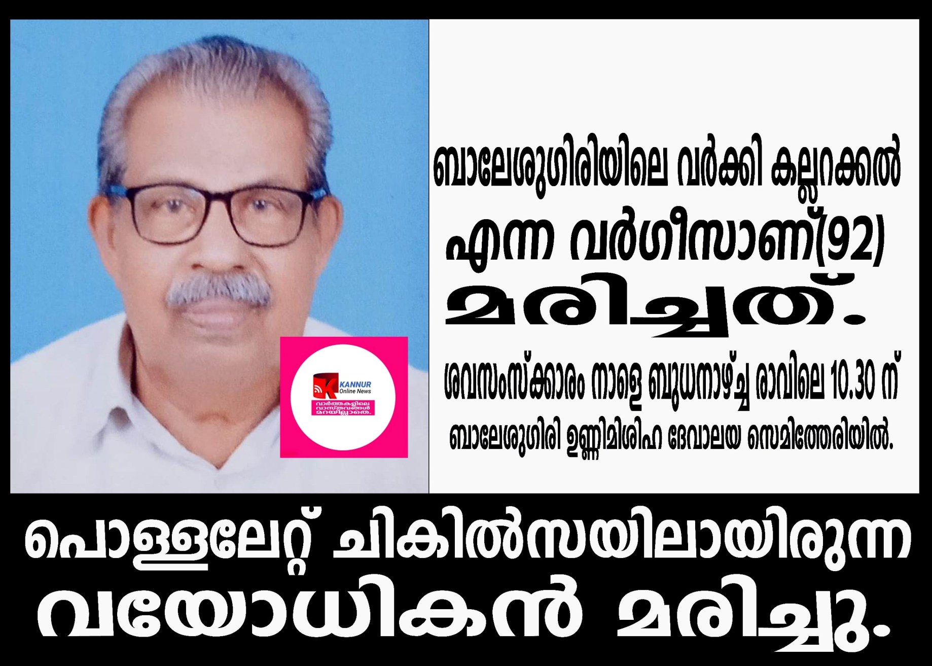 ബാലേശുഗിരിയിലെ വര്ക്കി കല്ലറക്കല് എന്ന വര്ഗീസാണ്(92) പരിയാരത്ത കണ്ണൂര് ഗവ.മെഡിക്കല് കോളേജില് ചികില്സക്കിടെ മരണപ്പെട്ടത്.