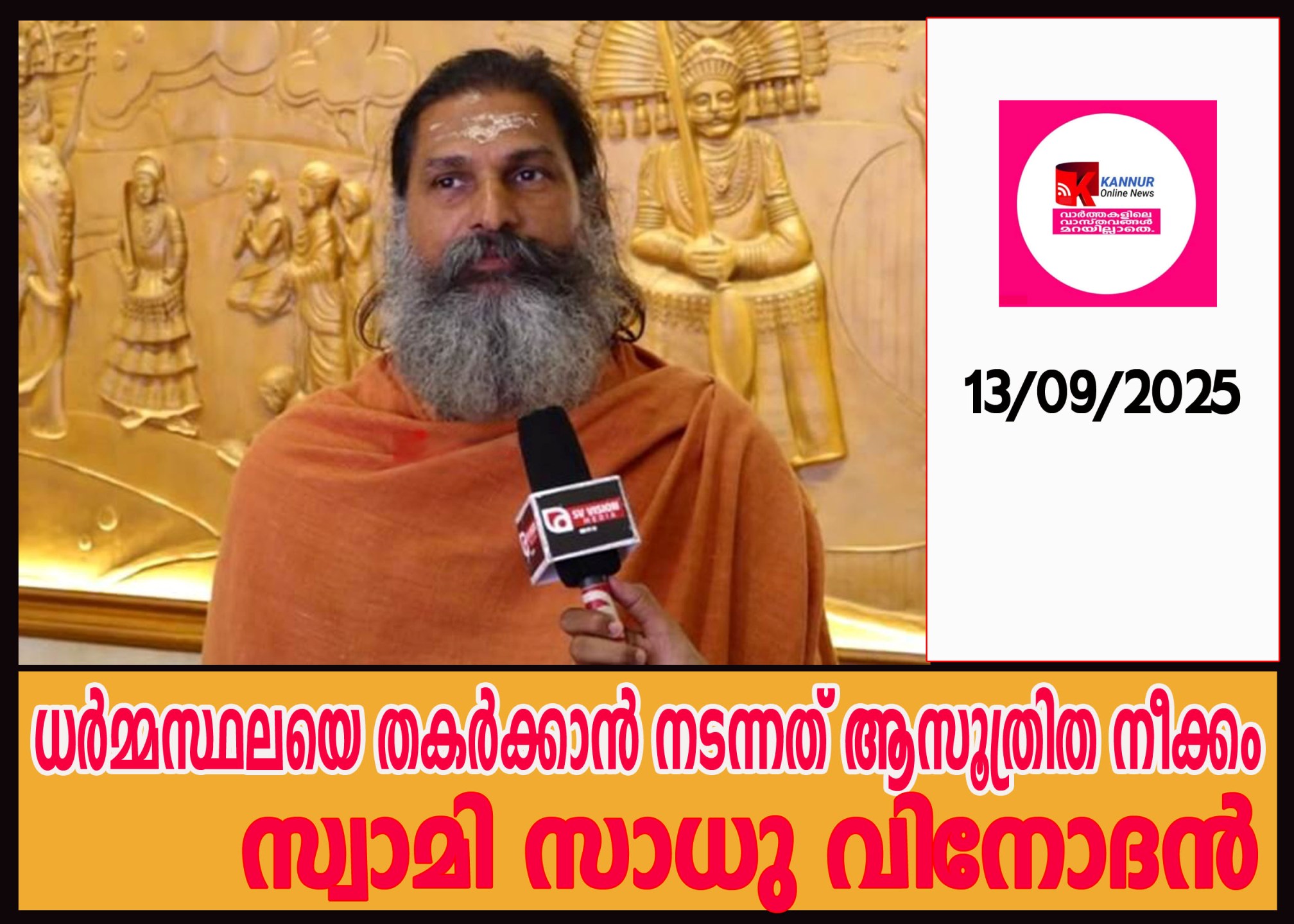 ധര്മ്മസ്ഥല: ലോകപ്രശസ്ത തീര്ത്ഥാടനകേന്ദ്രമായ ധര്സ്ഥലയെ തകര്ക്കാന് നടന്നത് ആസൂത്രിത നീക്കമാണെന്ന് സ്വാമി സാധുവിനോദന്.