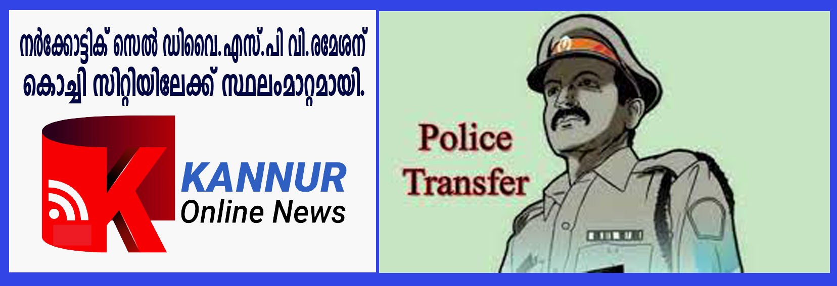 തളിപ്പറമ്പ്: കണ്ണൂര്‍ റൂറല്‍ പോലീസ് ജില്ലയിലെ നര്‍ക്കോട്ടിക് സെല്‍ ഡിവൈ.എസ്.പി വി.രമേശനെ കൊച്ചി സിറ്റി ക്രൈംബ്രാഞ്ചിലേക്ക് സ്ഥലംമാറ്റി.