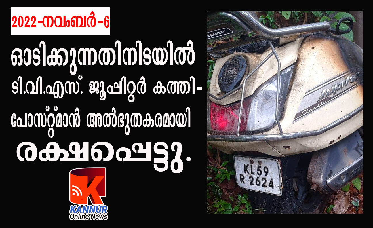 ടി.വി.എസ്. ജൂപ്പിറ്റര് കത്തി- പോസ്റ്റ്മാന് അല്ഭുതകരമായി രക്ഷപ്പെട്ടു.
