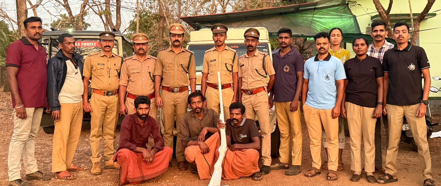 കാഞ്ഞങ്ങാട് റെയിഞ്ച് ഫോറസ്‌ററ് ഓഫീസര്‍ കെ.രാഹുലിന് ലഭിച്ച രഹസ്യവിവരത്തിന്റെ അടിസ്ഥാനത്തില്‍ സെക്ഷന്‍ ഫോറസ്റ്റ് ഓഫിസര്‍ ഒ.സുരേന്ദ്രന്റെ നിര്‍ദ്ദേശ പ്രകാരം ഭീമനടി സെക്ഷന്‍ ജീവനക്കാര്‍ നടത്തിയ പരിശോധനയ്ക്കിടയിലാണ് നായാട്ട് സംഘം പിടിയിലായത്.
