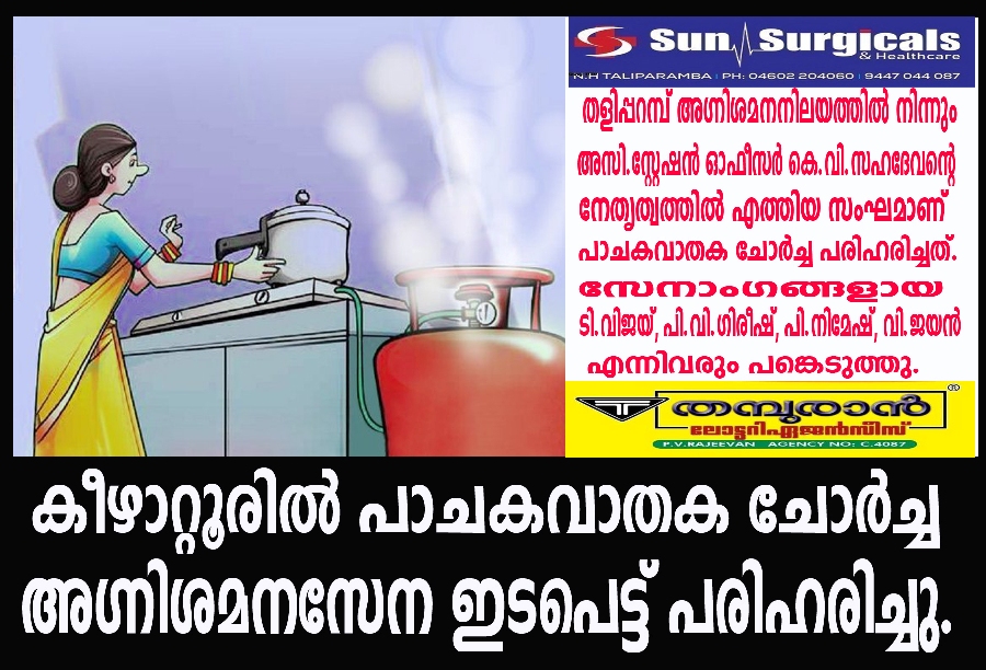 തളിപ്പറമ്പ് അഗ്നിശമനനിലയത്തില് നിന്നും അസി.സ്റ്റേഷന് ഓഫീസര് കെ.വി.സഹദേവന്റെ നേതൃത്വത്തില് എത്തിയ സംഘമാണ് പാചകവാതക ചോര്ച്ച പരിഹരിച്ചത്.