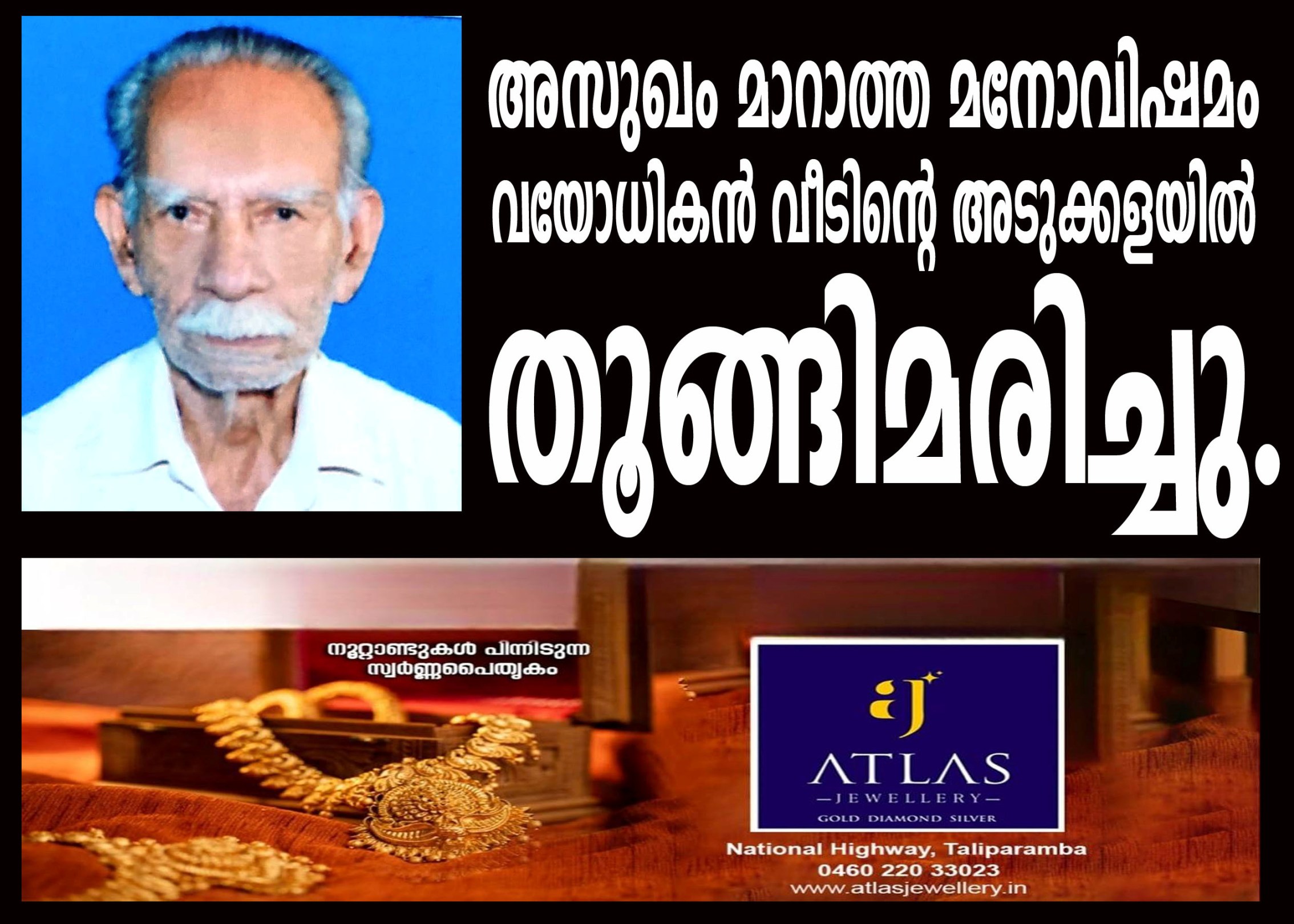 ഉദയഗിരി: അസുഖം മാറാത്ത മനോവിഷമം കാരണം വയോധികന് വീടിന്റെ അടുക്കളയില് തൂങ്ങിമരിച്ചു.