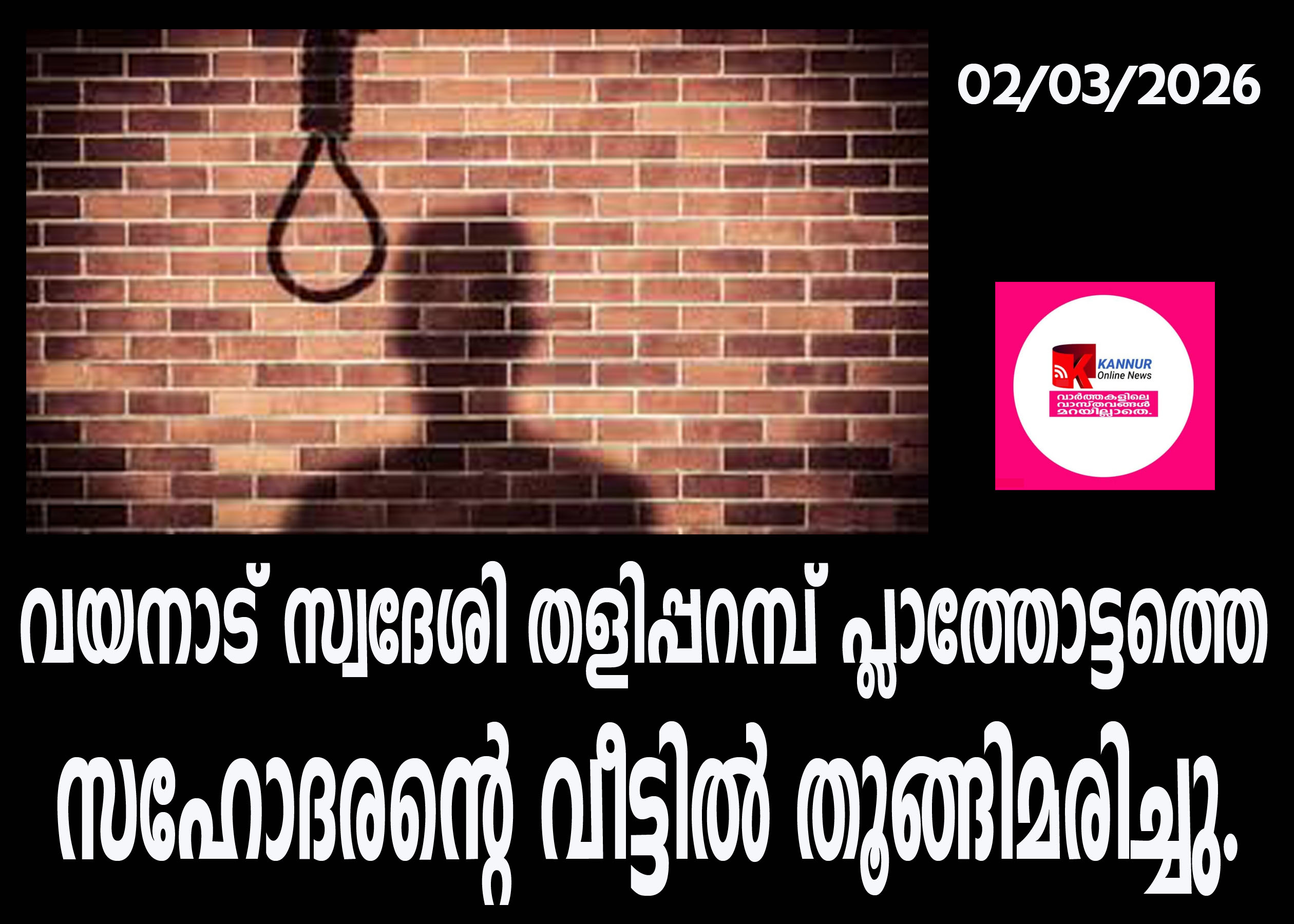 തളിപ്പറമ്പ്: വയനാട് സ്വദേശി തളിപ്പറമ്പ് പ്ലാത്തോട്ടത്തെ വീട്ടില് തൂങ്ങിമരിച്ചു.