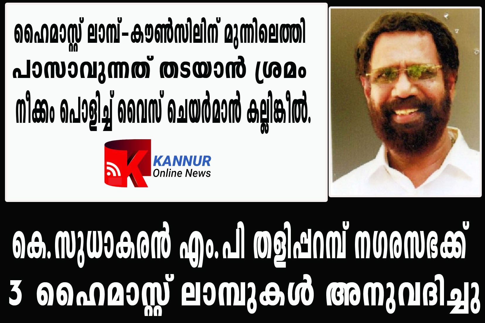 കെ.സുധാകരന് എം.പി തളിപ്പറമ്പ് നഗരസഭയില് അനുവദിച്ച മൂന്ന് ഹൈമാസ്റ്റ് വിളക്കുകള് അംഗീകരിക്കുന്നത് ഇന്ന് നടന്ന നഗരസഭാ കൗണ്സില് യോഗത്തില് ആദ്യം അംഗീകാരത്തിന് വന്നിരുന്നില്ല.