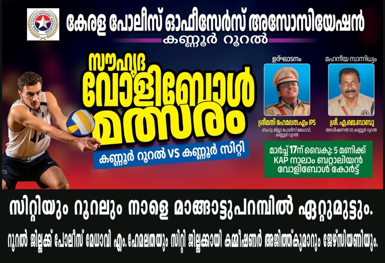 നാളെ മാര്ച്ച് 17 ന് വൈകുന്നേരം 5 മണിക്ക് മാങ്ങാട്ടുപറമ്പ് കെ.എ.പി ഗ്രൗണ്ടില് നടക്കുന്ന പരിപാടി റൂറല് പോലീസ് മേധാവി എം.ഹേമലത ഐ.പി.എസ്. ഉദ്ഘാടനം ചെയ്യും.