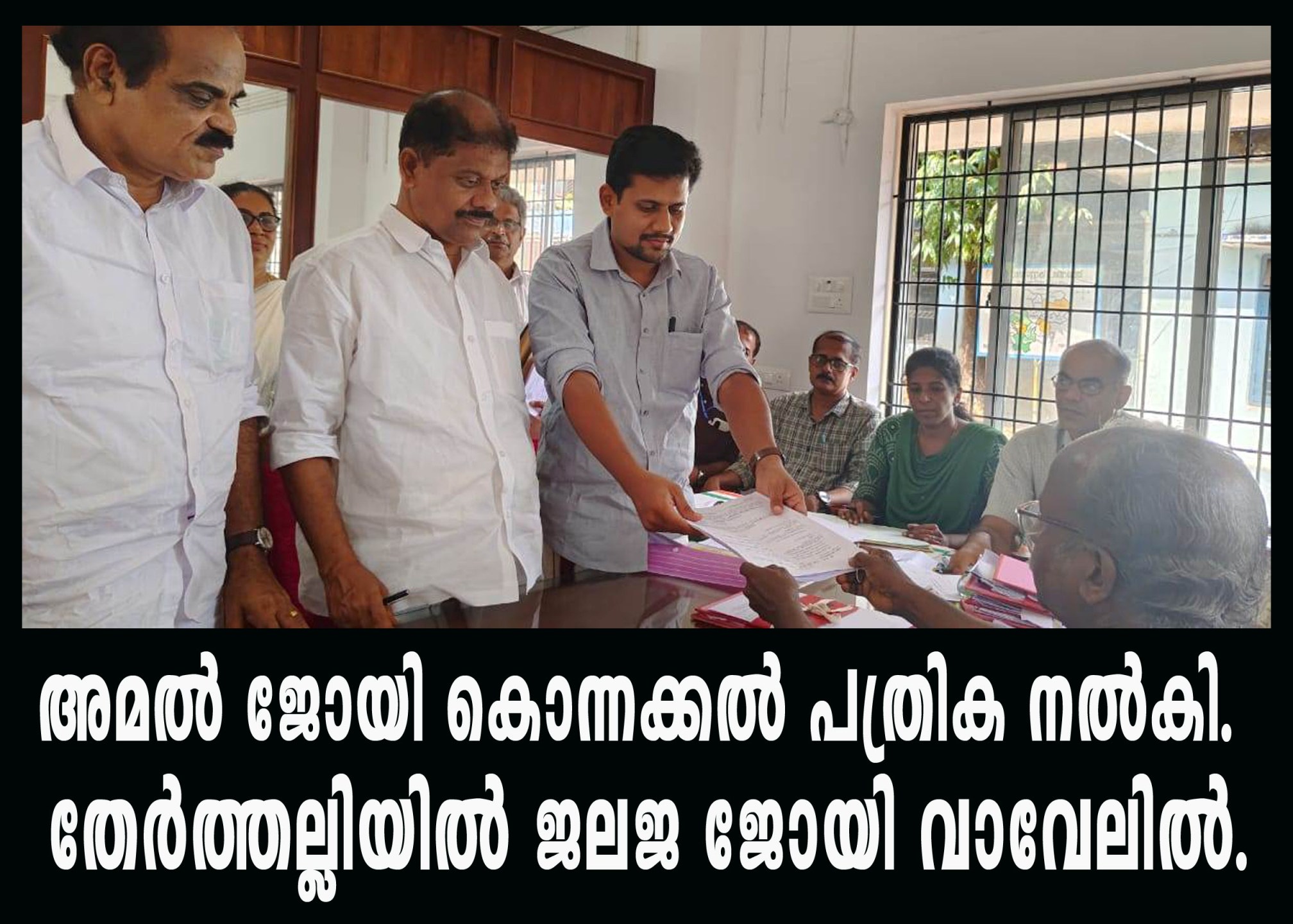 അമല് ജോയി കൊന്നക്കല് പത്രിക നല്കി, തേര്ത്തല്ലിയില് ജലജ ജോയി വാവേലില്.