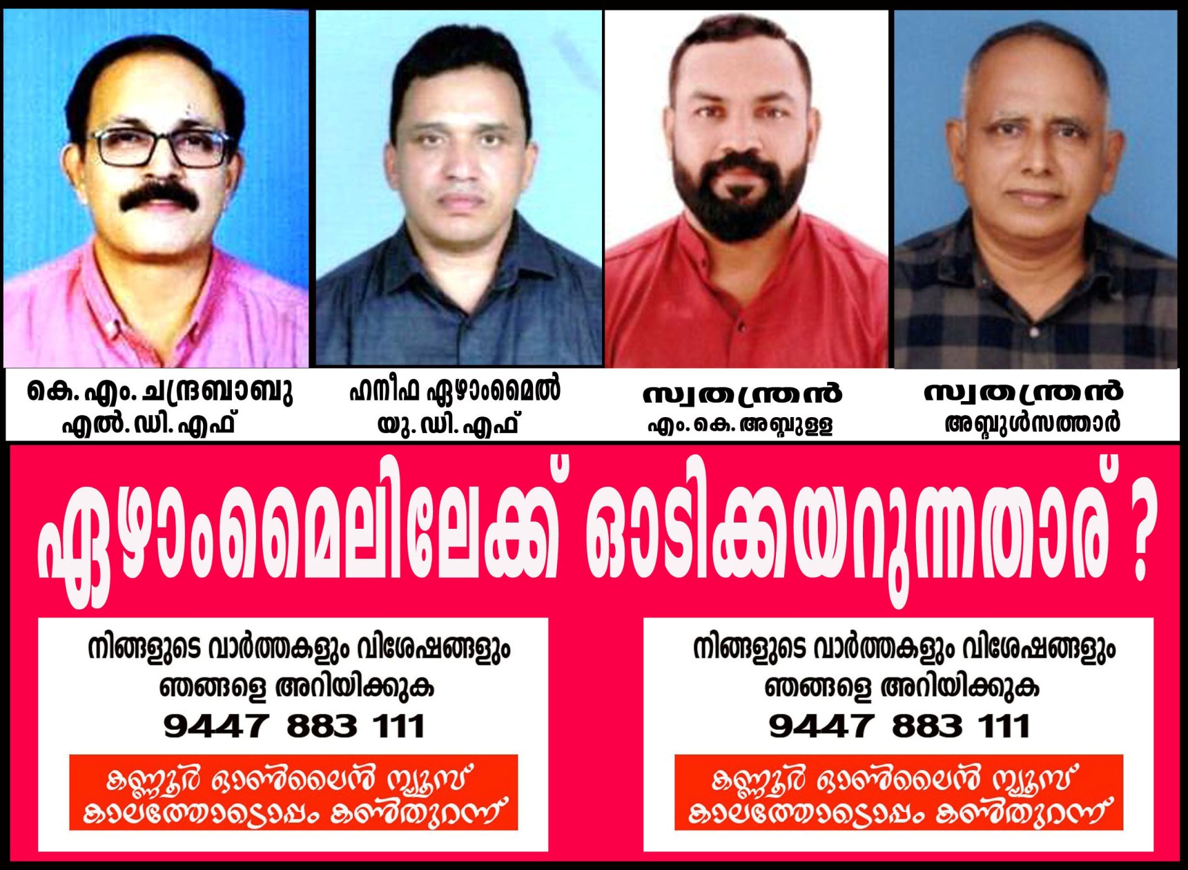 സി.പി.എമ്മിലെ കെ.എം.ചന്ദ്രബാബു(58)എല്‍.ഡി.എഫ് സ്ഥാനാര്‍ത്ഥിയായും ഹനീഫ ഏഴാംമൈല്‍(48) യു.ഡി.എഫ് സ്ഥാനാര്‍ത്ഥിയായം മല്‍സരിക്കുന്നു.