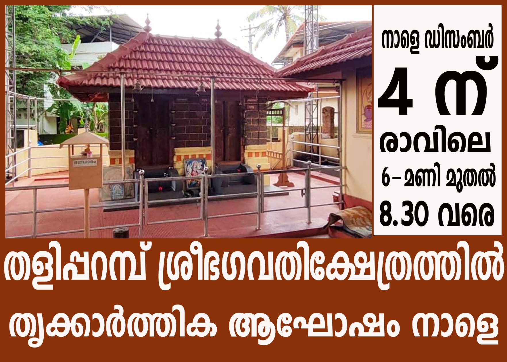 ജില്ലാ വാർത്തകൾ തളിപ്പറമ്പ് ശ്രീഭഗവതിക്ഷേത്രത്തില് തൃക്കാര്ത്തിക ആഘോഷം നാളെ-ഡിസംബര് നാലിന് Kannur News December 3, 2025 തളിപ്പറമ്പ്: പെരുഞ്ചെല്ലൂര് ഗ്രാമത്തില് തളിപ്പറമ്പ് നഗരമധ്യത്തിലെ പുരാണപ്രസിദ്ധമായ തളിപ്പറമ്പ് ശ്രീഭഗവതിക്ഷേത്രത്തില് തൃക്കാര്ത്തിക ആഘോഷം ഡിസംബര് നാലിന് നാളെ നടക്കും. രാവിലെ 6 ന് നടതുറക്കും. 8.30 വരെയാണ് ദര്ശനസമയം.