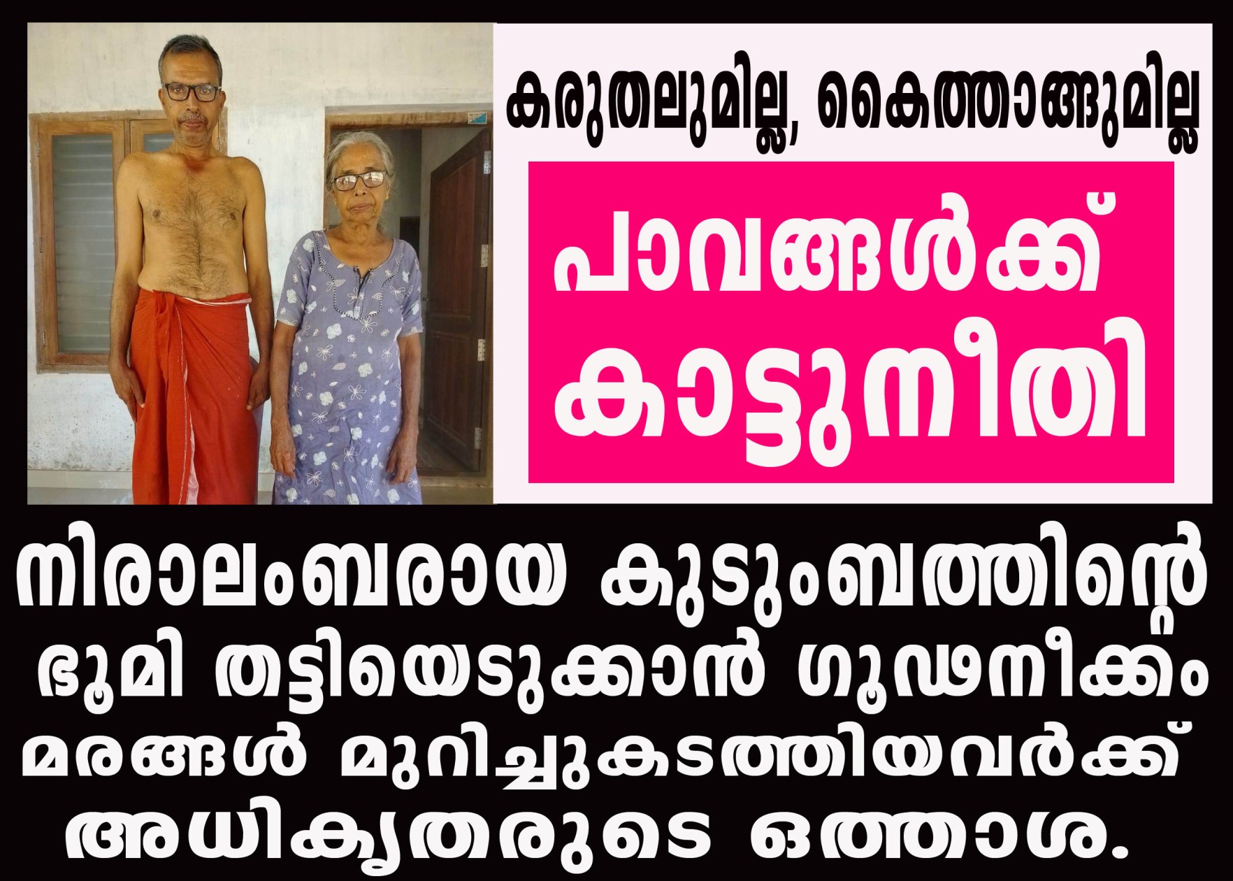 തളിപ്പറമ്പ്: നിരാലംബരായ കുടുംബത്തിന്റെ ഭൂമി തട്ടിയെടുക്കാനും മരങ്ങള് മുറിച്ചുകടത്താനും ഭൂമാഫിയക്ക് പോലീസും റവന്യൂ അധികൃതരും കൂട്ടുനില്ക്കുന്നതായി പരാതി.