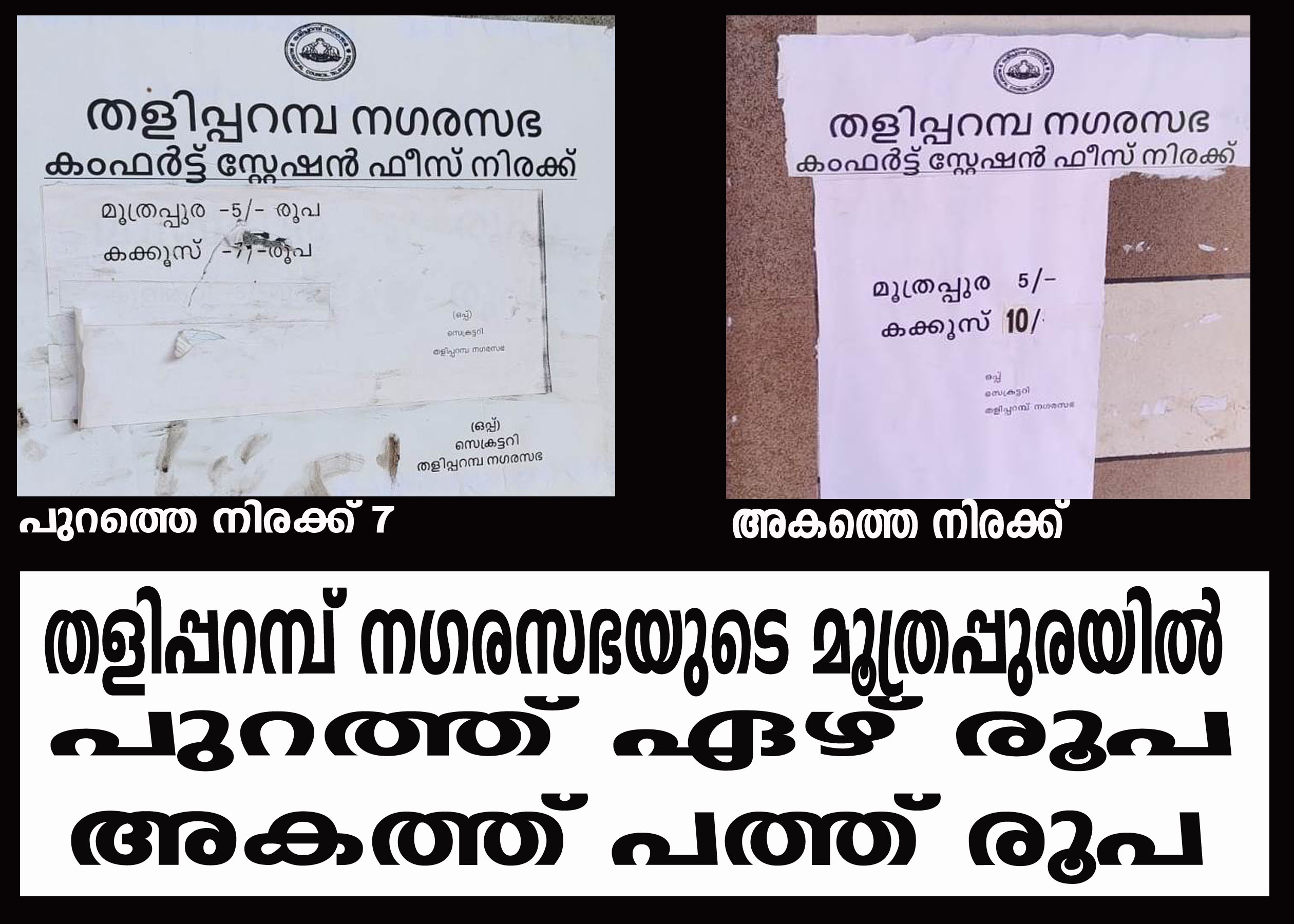 തളിപ്പറമ്പ്: തളിപ്പറമ്പ് നഗരസഭയുടെ ബസ്റ്റാന്റ് കംഫര്ട്് സ്റ്റേഷനില് മൂത്രമൊഴിക്കാന് 5 രൂപയും കക്കൂസ് ഉപയോഗിക്കാന് 10 രൂപയും വാങ്ങുന്നു.