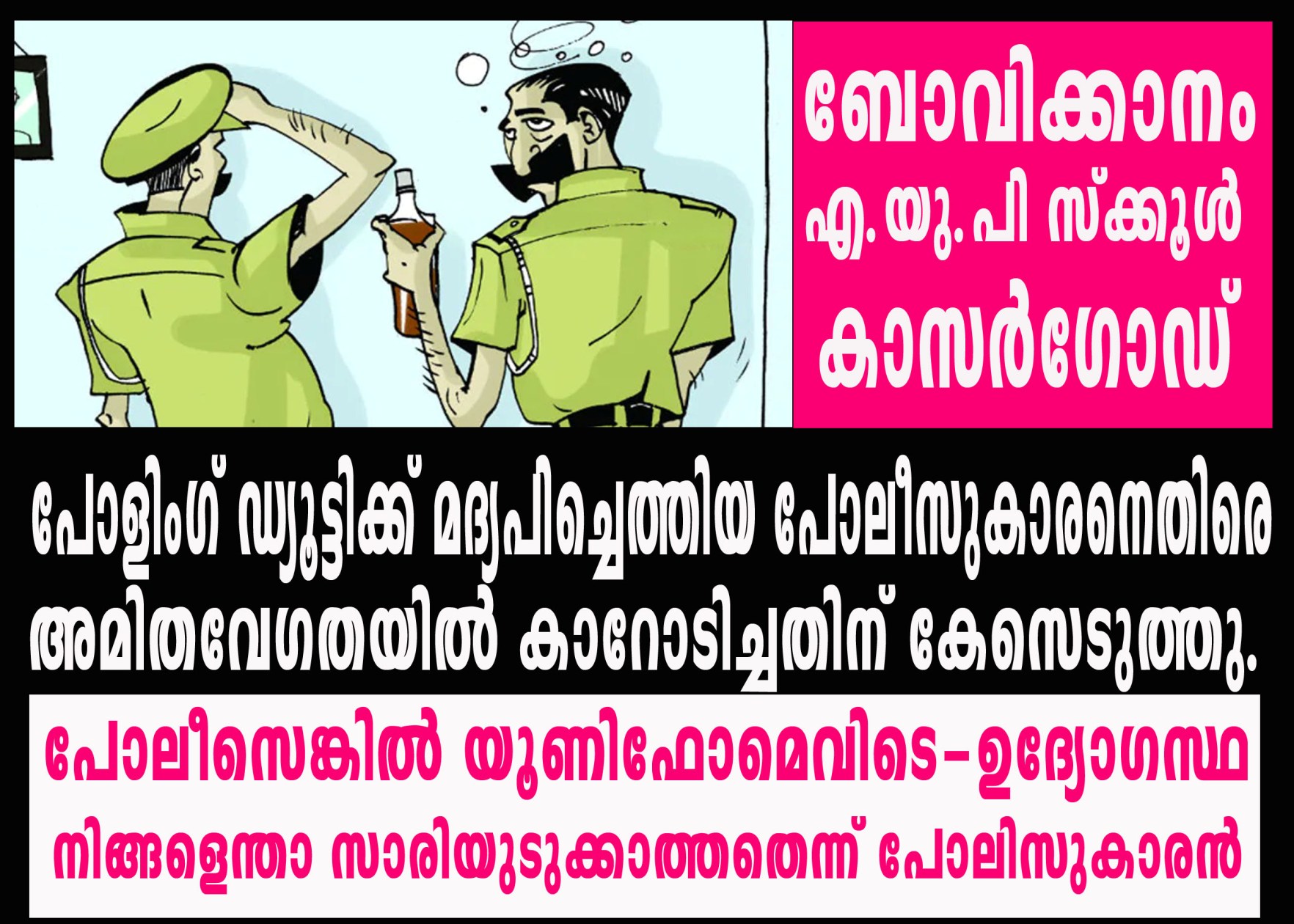 ബോവിക്കാനം:തെരഞ്ഞെടുപ്പ്   ഡ്യൂട്ടിക്കെത്തിയ പോലീസുകാരന്‍ മദ്യപിച്ച് ബഹളമുണ്ടാക്കി, പ്രിസൈഡിംഗ് ഓഫീസറോട് മോശമായി പെരുമാറി. പോലീസ് എത്തിയപ്പോള്‍ കാറില്‍ കയറി രക്ഷപ്പെട്ടു. സി.പി.ഒ സനൂപ് ജോണ്‍ എന്നയാളാണ് കാറില്‍ രക്ഷപ്പെട്ടത്. സംഭവത്തില്‍ ആദൂര്‍ പോലീസ് അമിതവേഗതിയില്‍ കാറോടിച്ച് പോയതിന് കേസെടുത്തു.