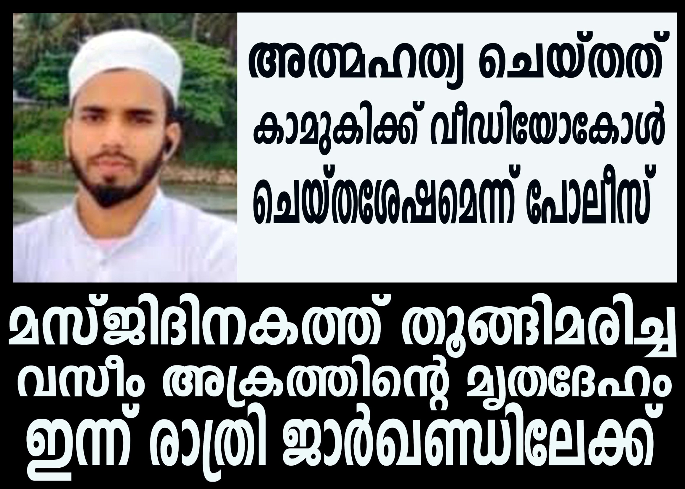 മസ്ജിദിനകത്ത് തൂങ്ങിമരിച്ച വസീം അക്രത്തിന്റെ മൃതദേഹം ഇന്ന് രാത്രി ജാര്‍ഖണ്ഡിലേക്ക് കൊണ്ടുപോകും