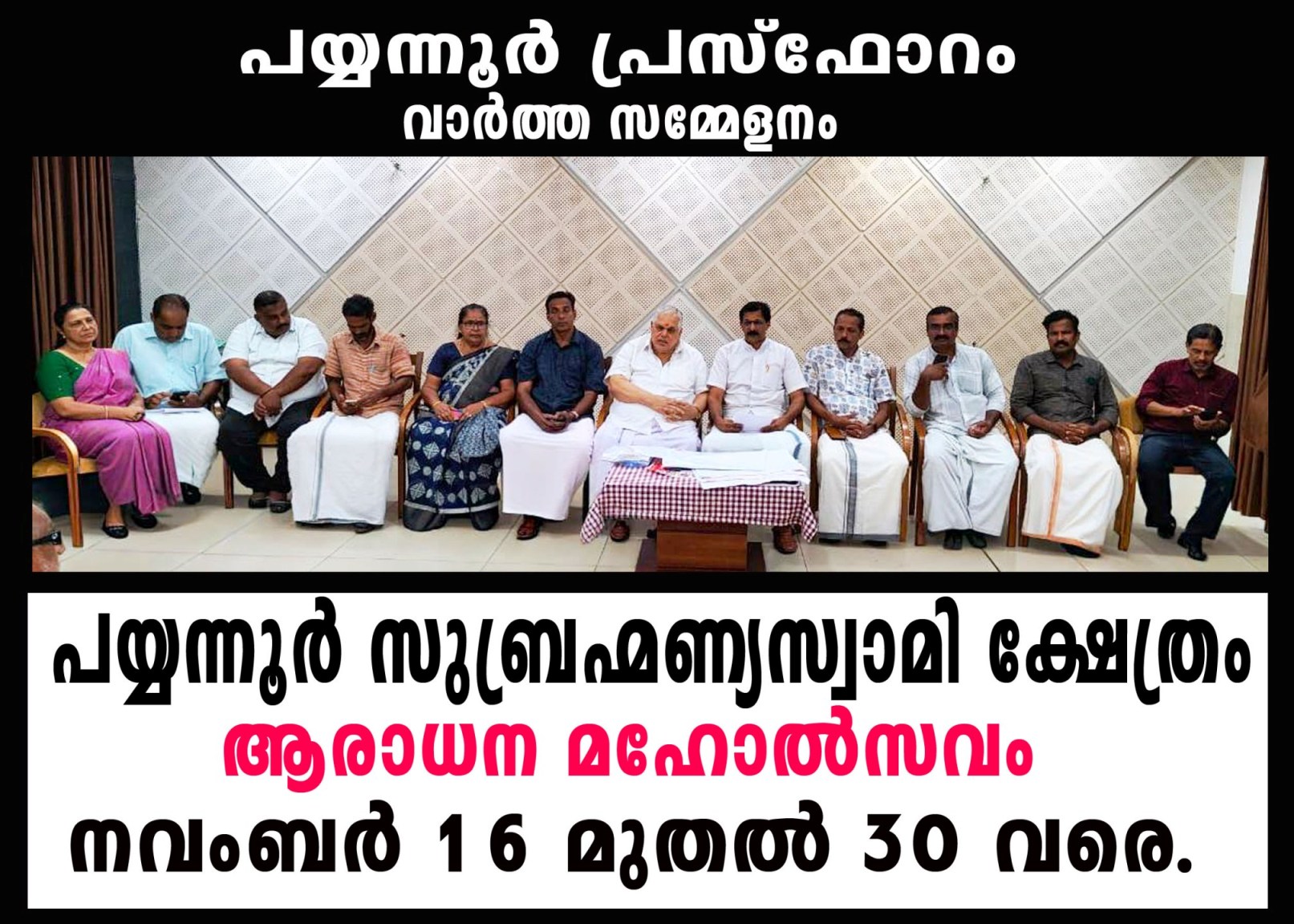 വാര്ത്ത സമ്മേളനത്തില് ആഘോഷ കമ്മിറ്റി ചെയര്മാന് എ.വി.മാധവ പൊതുവാള്, ക്ഷേത്രം എക്സിക്യൂട്ടീവ് ഓഫീസര് കെ.പി. സുനില്കുമാര്, ട്രസ്റ്റി അംഗങ്ങളായ അനില് പുത്തലത്ത്, എ.കെ.രാജേഷ്, സി.കെ.പ്രമോദ്, രാജു അത്തായി, ആഘോഷ കമ്മിറ്റി ഭാരവാഹികളായ എ.യു.ബാലകൃഷ്ണന്, പ്രകാശ് മഹാദേവ ഗ്രാമം, ആര്.പ്രമീള, ടി.എ.രഞ്ജിനി, സി.കെ ദിനേശന് എന്നിവരും പങ്കെടുത്തു.