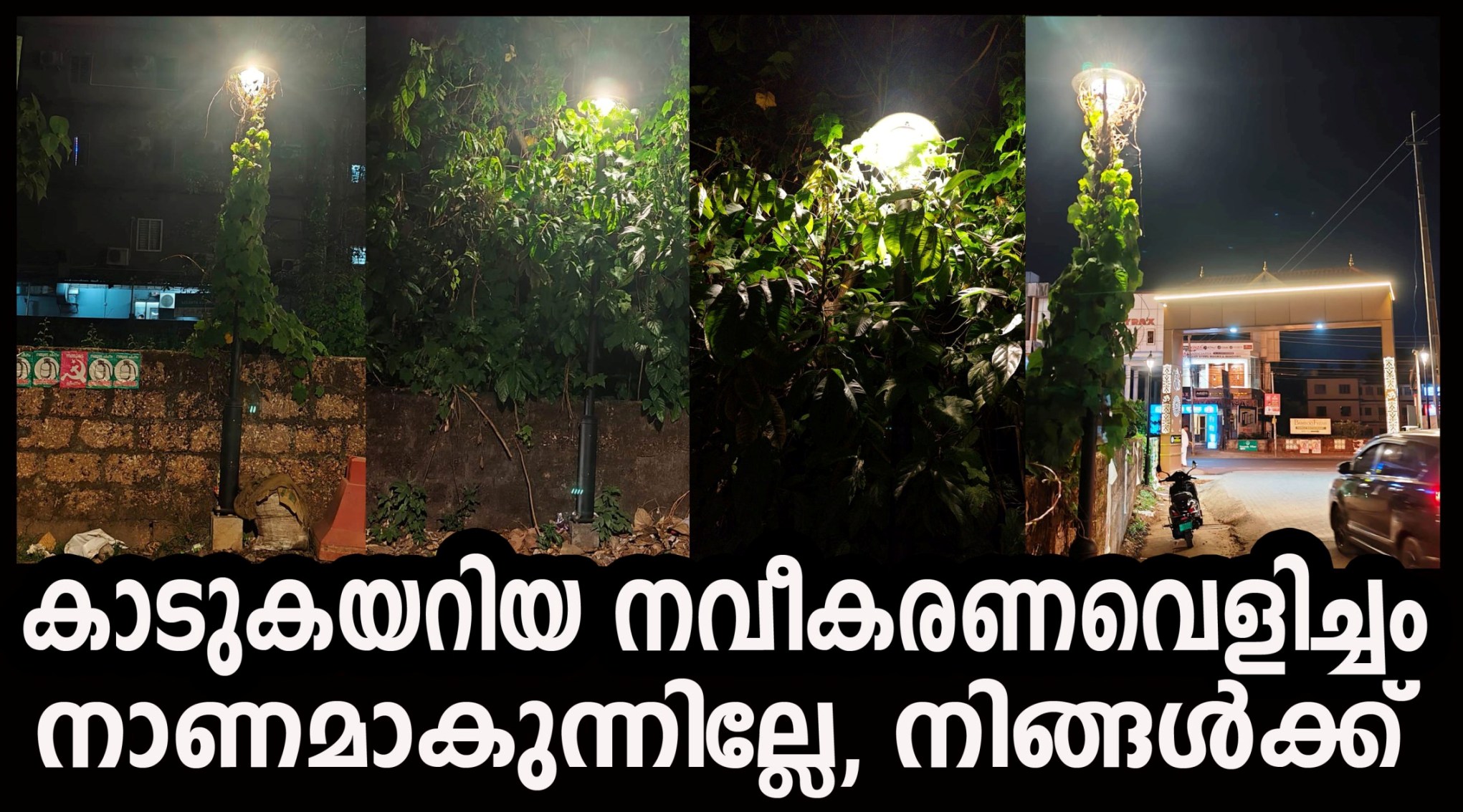 തളിപ്പറമ്പ്: ക്ഷേത്രവഴിയിലെ വിളക്കുകളില് കാടുകയറി, തളിപ്പറമ്പ് രാജരാജേശ്വരക്ഷേത്രത്തിലേക്കുള്ള വഴിയില് കുറച്ചുദിവസംമുമ്പ് തെളിഞ്ഞുതുടങ്ങിയ വഴിവിളക്കുകളുടെ കാലുകളിലേക്കാണ് കാടുകളും വള്ളിപ്പടര്പ്പുകളും മൂടി നില്ക്കുന്നത്.