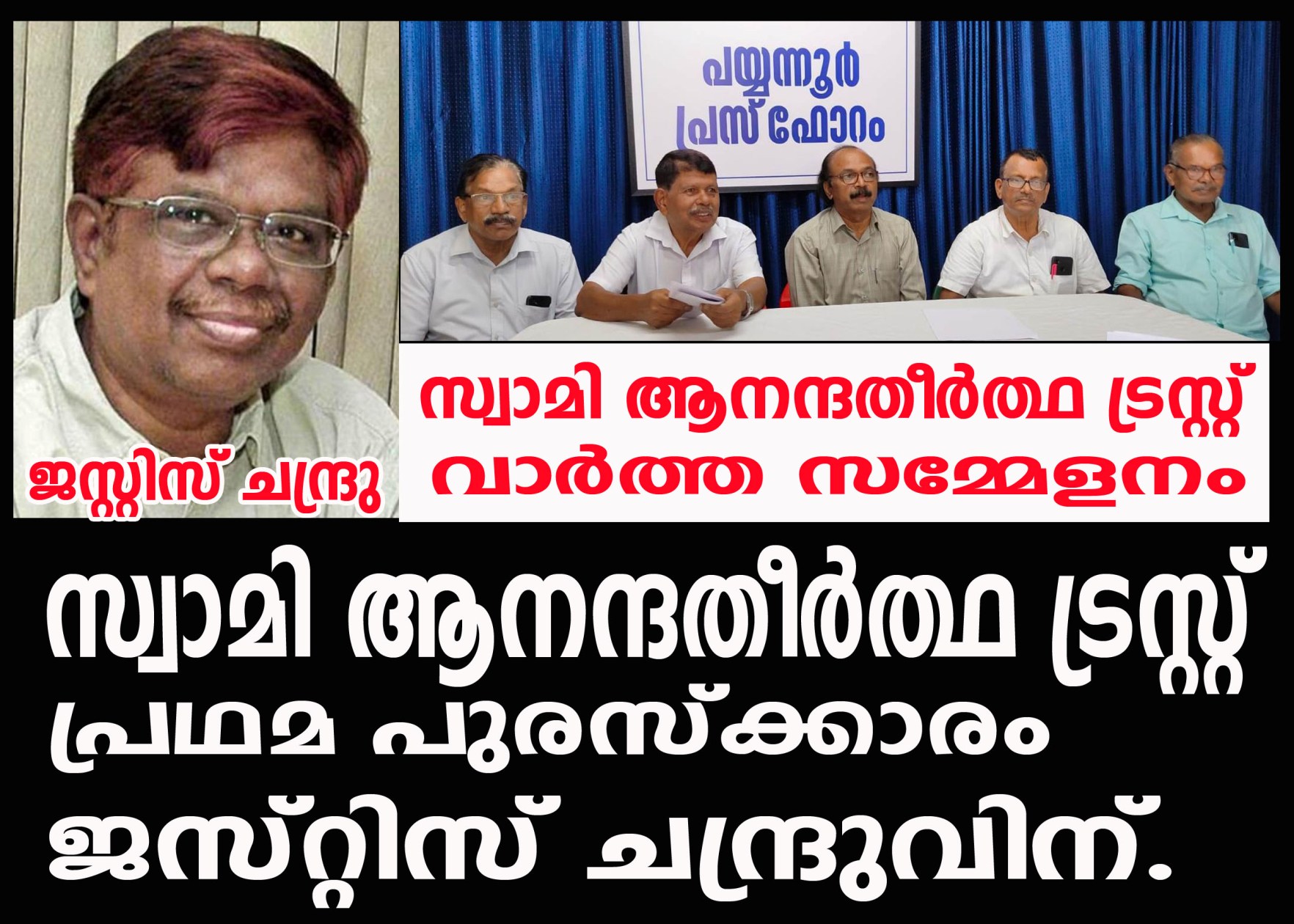 പയ്യന്നൂര്‍: സ്വാമി ആനന്ദതീര്‍ത്ഥ ട്രസ്റ്റ് പ്രഥമ പുരസ്‌ക്കാരം ജസ്റ്റിസ് ചന്ദ്രുവിന്.