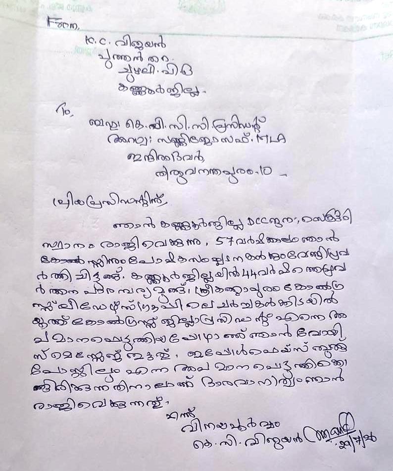 കഴിഞ്ഞ ദിവസം യൂത്ത് കോണ്ഗ്രസ് ജില്ലാ പ്രസിഡന്റ് വിജില് മോഹനെക്കുറിച്ച് ശ്രീകണ്ഠാപുരം ലീഡേഴ്സ് ഗ്രൂപ്പില് നടത്തിയ രൂക്ഷമായ വിമര്ശനം വിവാദമായതിനെ തുടര്ന്നാണ് രാജി.
