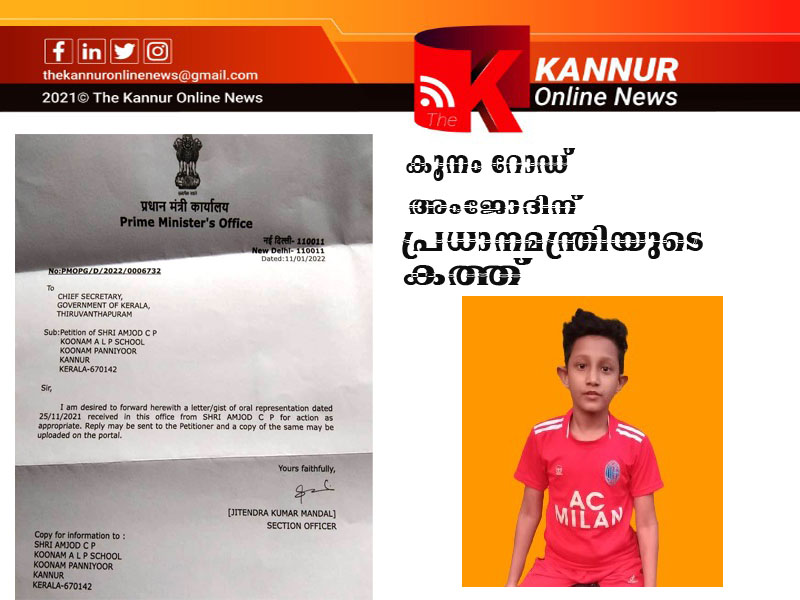 കഴിഞ്ഞ ദിവസമാണ് പ്രധാനമന്ത്രിയുടെ ഓഫീസില് നിന്നുള്ള മറുപടി അംജോദിന് ലഭിച്ചത്. കെ.എന്.രാജുവിന്റെയും സി.പി.ധന്യയുടെയും മകനാണ് അംജോദ്.