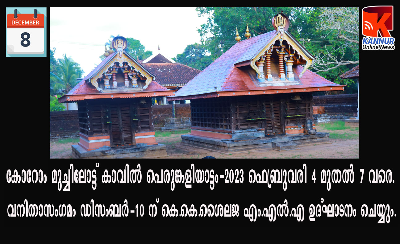 കോറോം മുച്ചിലോട്ട് കാവില് പെരുങ്കളിയാട്ടം-2023 ഫെബ്രുവരി 4 മുതല് 7 വരെ.– വനിതാസംഗമം ഡിസംബര്-10 ന് കെ.കെ.ശൈലജ എം.എല്.എ ഉദ്ഘാടനം ചെയ്യും.