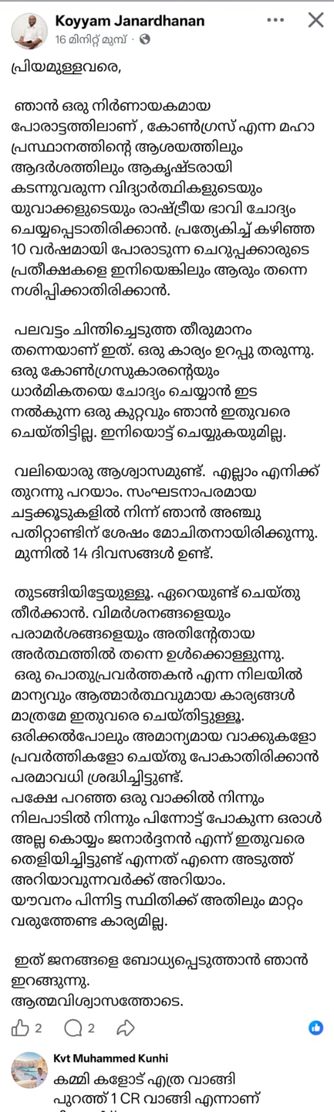 ഞാന്‍ ഒരു നിര്‍ണായകമായ പോരാട്ടത്തിലാണ്, കോണ്‍ഗ്രസ് എന്ന മഹാപ്രസ്ഥാനത്തിന്റെ ആശയത്തിലും ആദര്‍ശത്തിലും ആകൃഷ്ടരായി കടന്നുവരുന്ന വിദ്യാര്‍ത്ഥികളുടെയും യുവാക്കളുടെയും രാഷ്ട്രീയ ഭാവി ചോദ്യം ചെയ്യപ്പെടാതിരിക്കാന്‍. പ്രത്യേകിച്ച് കഴിഞ്ഞ 10 വര്‍ഷമായി പോരാടുന്ന ചെറുപ്പക്കാരുടെ പ്രതീക്ഷകളെ ഇനിയെങ്കിലും ആരും തന്നെ നശിപ്പിക്കാതിരിക്കാന്‍.