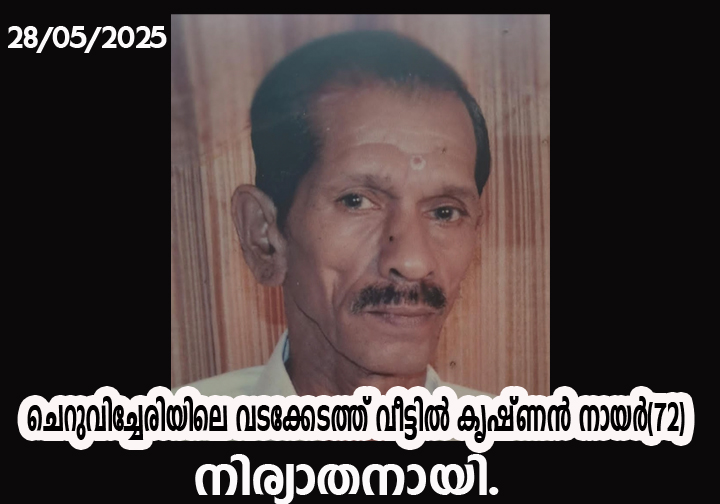 ചെറുവിച്ചേരിയിലെ വടക്കേടത്ത് വീട്ടില് കൃഷ്ണന് നായര്(72) നിര്യാതനായി.