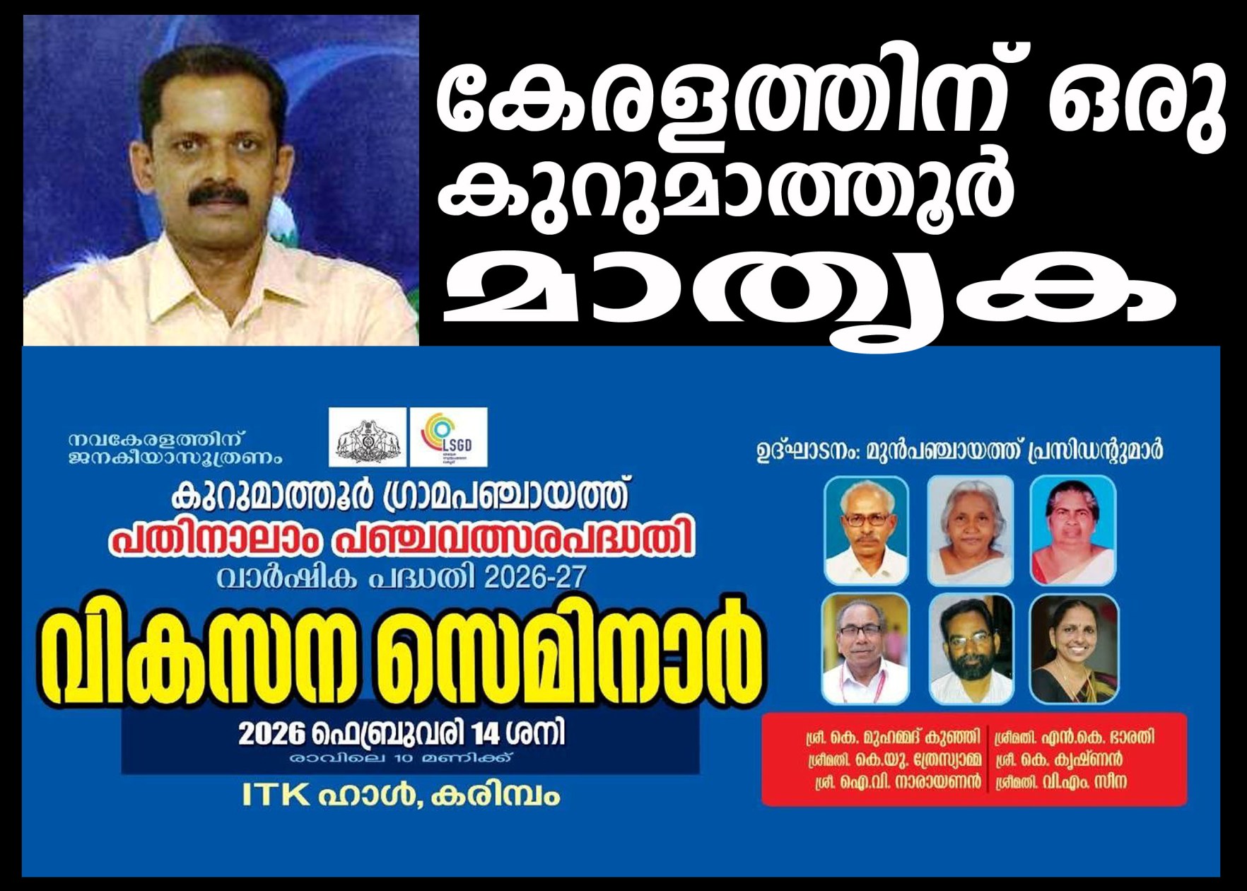 കെ.മുഹമ്മദ്കുഞ്ഞി. എന്.കെ.ഭാരതി, കെ.യു.ത്രേസ്യാമ്മ, കെ.കൃഷ്ണന്, ഐ.വി. നാരായണന്, വി.എം.സീന എന്നീ ആറ് മുന് പഞ്ചായത്ത്പ്രസിഡന്റുമാര് ചേര്ന്നാണ് ഫിബ്രവരി 14 ന് രാവിലെ 10 മണിക്ക് കരിമ്പം ഐ.ടി.കെ. ഹാളില് നടക്കുന്ന വികസന സെമിനാര് ഉദ്ഘാടനം ചെയ്യുന്നത്.
