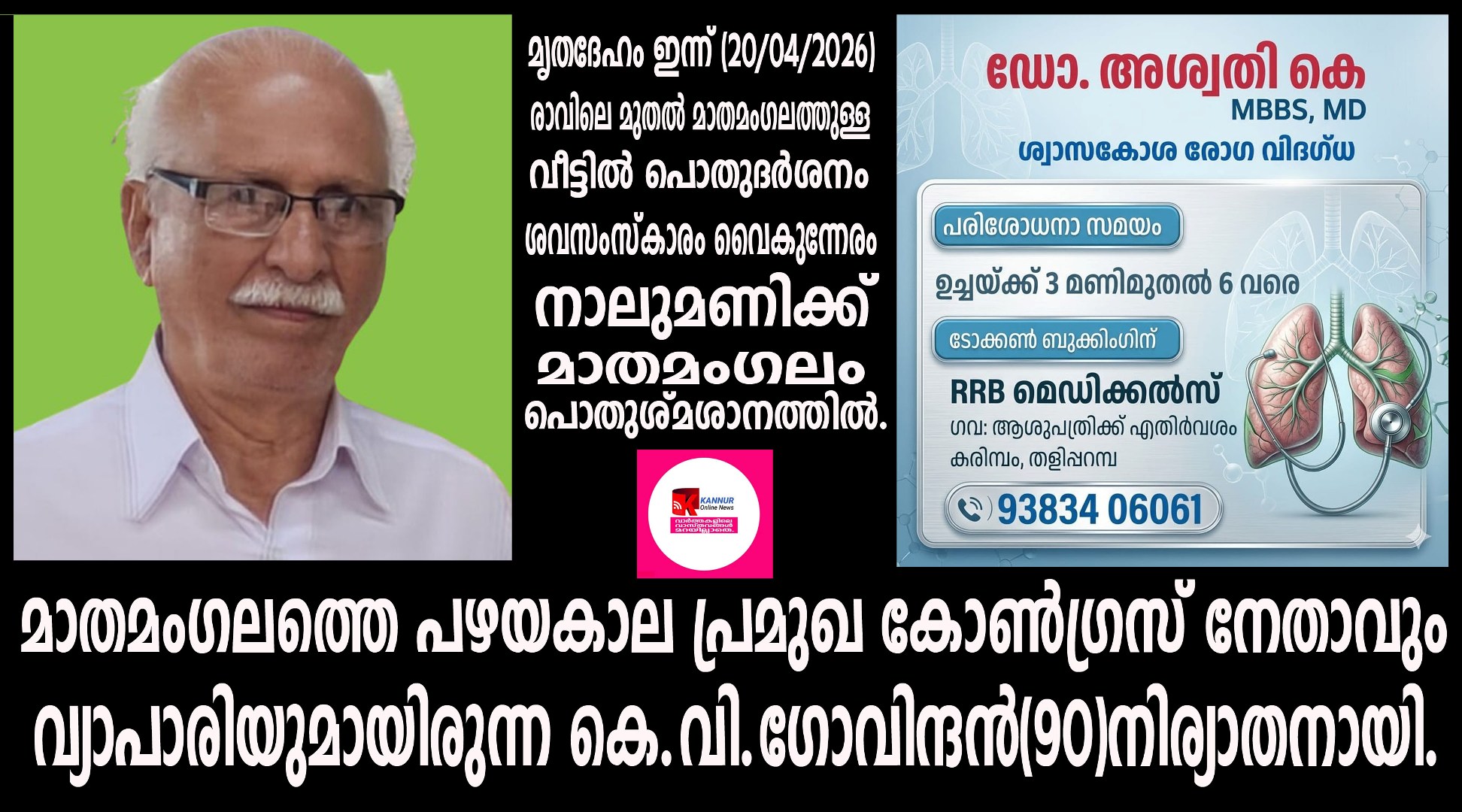 മൃതദേഹം ഇന്ന് (20/04/2026) രാവിലെ മുതല് മാതമംഗലത്തുള്ള വീട്ടില് പൊതുദര്ശനം,