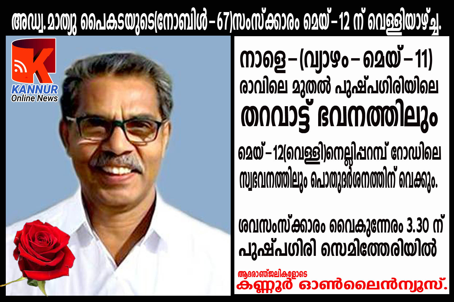 അഡ്വ.മാത്യു പൈകടയുടെ(നോബിള്-67)സംസ്ക്കാരം മെയ്-12 ന് വെള്ളിയാഴ്ച്ച-വൈകുന്നേരം 3.30ന്-