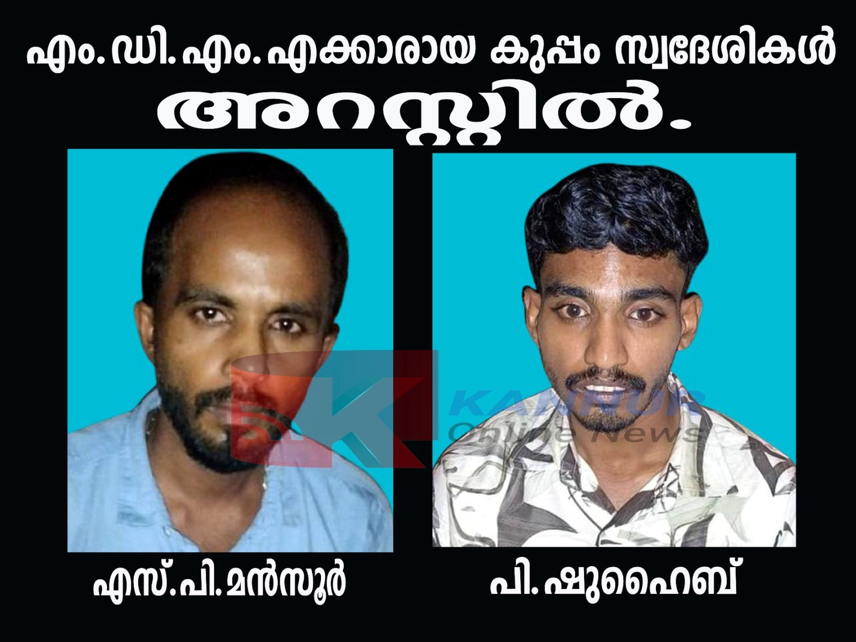മുക്കുന്നിലെ സൂപ്പി പോക്കറകത്ത് വീട്ടില് എസ്.പി.മന്സൂര്(36), പുള്ളിയില് വീട്ടില് ഷുഹൈബ്(23)എന്നിവരെയാണ് കണ്ണൂര് റൂറല് പോലീസ് മേധാവി എം.ഹേമലതയുടെ മേല്നോട്ടത്തില് പ്രവര്ത്തിക്കുന്ന ഡാന്സാഫ് ടീമംഗങ്ങളും തളിപ്പറമ്പ് എസ്.എച്ച്.ഒ എം.എല്.ബെന്നിലാലു, എസ്.ഐ പി.റഫീക്ക് എന്നിവരുടെനേതൃത്വത്തിലാണ് ഇവരെ പിടികൂടിയത്.